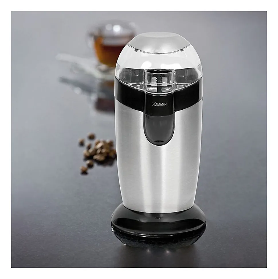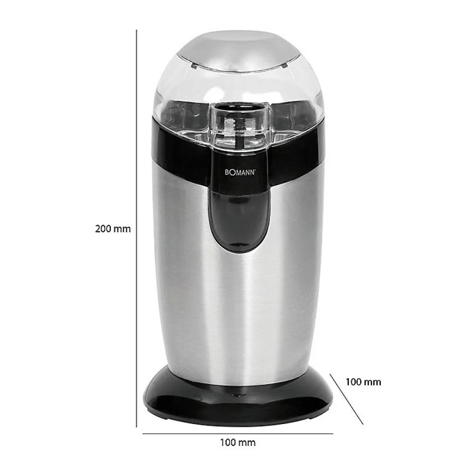 Moulin à café électrique avec batteurBoîtier en acier inoxydableLame du batteur en acier inoxydableRécipient à grains en acier inoxydable (protection des arômes et hygiène)Couvercle transparentCapacité d’environ 40 g de grains (20 tasses de café)Puissant moteur de 120 wattsCircuit de sécurité – fonctionnement uniquement avec le couvercle en placeBouton-poussoir de sécurité également pour le fonctionnement par impulsionsLe degré de mouture peut être sélectionné en fonction de la durée de fonctionnement.Rangement du cordon220-240 V, 50-60 Hz, 120 W