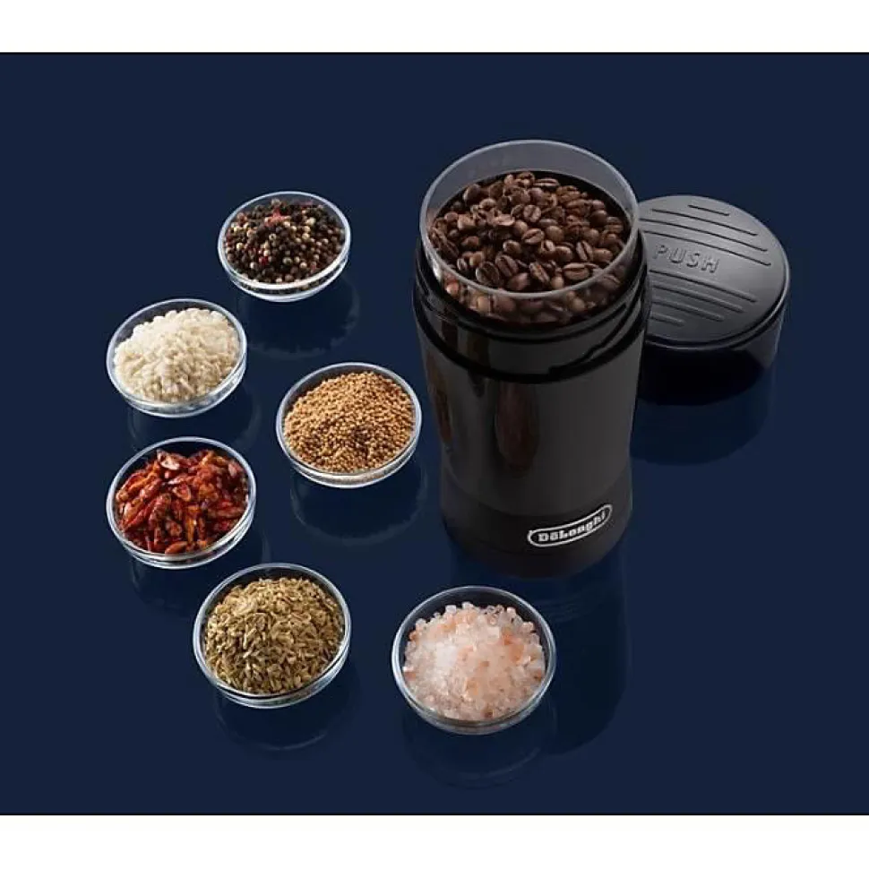 Moulin à café électrique KG200 DeLonghi 170 W Noir avec bac à grains amovible de 90 g, lames en inox et technologie Push to Grind pour un broyage simple et homogène. Comprend une brosse de nettoyage. Compact (13 x 11 x 25 cm) et adapté pour moudre jusqu’à 12 tasses.