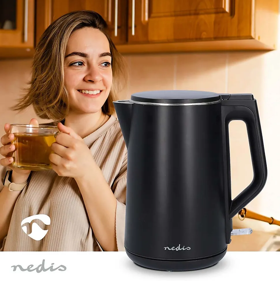 Cette bouilloire élégante a une capacité de 1.5 litre et grâce à la puissance de 2200 W. vous aurez votre thé prêt en un rien de temps. La finition noire fait de cette bouilloire un objet élégant. durable et facile à nettoyer. qui s’intégrera parfaitement dans votre cuisine. La bouilloire a un boîtier à double paroi qui maintient la température de l’eau plus longtemps.Grâce à sa base à 360°. la bouilloire convient aussi bien aux gauchers qu’aux droitiers. La bouilloire est détachable de la base. ce qui facilite le remplissage et le versement de l’eau. Le grand couvercle et l’élément chauffant dissimulé facilitent le nettoyage.Lorsque l’eau bout. la bouilloire s’arrête automatiquement et dispose d’une protection contre l’ébullition.Les pieds antidérapants garantissent la stabilité et la sécurité de la bouilloire. Le cordon peut être enroulé autour de la base afin de placer facilement la bouilloire dans votre cuisine ou sur votre plan de travail.1.5 lPlastiqueNoirRotatif à 360 degrésÉlément chauffant dissimuléContrôleur StrixProtection contre l’ébullition