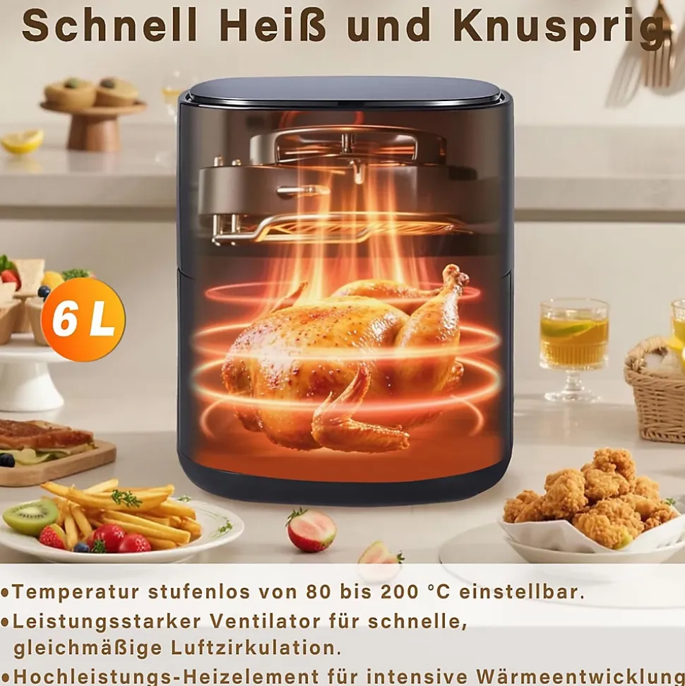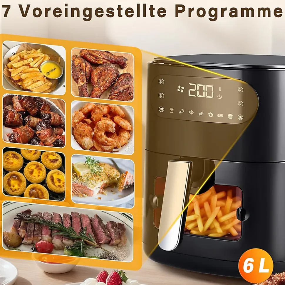 【CUISSON SANS HUILE】Avec la friteuse à air Nettlife, vous pouvez cuisiner sainement sans huile. La combinaison de l’air chaud circulant et d’une température de cuisson optimale garantit des frites croustillantes et des cuisses de poulet tendres et juteuses. Un bip sonore retentit lorsque le temps de cuisson est écoulé ; une expérience gustative unique vous attend.【CUISSON POLYVALENTE】La friteuse à air est dotée d’un écran LED clair avec 7 programmes préréglés, sélectionnables via l’écran tactile. D’une simple pression sur un bouton, vous pouvez préparer vos plats préférés tout en vous concentrant sur d’autres tâches. La température (80-200 °C) et le temps de cuisson (jusqu’à 60 minutes) sont réglables manuellement : une utilisation plus simple que jamais.【FENÊTRE DE VISUALISATION ET CAPACITÉ XXL】La friteuse à air Nettlife est équipée d’un panier de friture de grande capacité de 6 L et d’une fenêtre de visualisation éclairée qui vous permet de visualiser clairement l’état de cuisson sans avoir à ouvrir le panier. La friteuse à air Nettlife XXL 6 L est spécialement conçue pour les cuisines familiales de 5 à 6 personnes. Avec une puissance de 1500 W, elle est très puissante, réduit le temps de cuisson et économise ainsi l’électricité.【FACILE À NETTOYER ET SÛR À UTILISER】Cette friteuse à air est particulièrement facile d’entretien : le panier de friture est facile à nettoyer et amovible grâce à son revêtement antiadhésif. La poignée froide au toucher prévient les brûlures et les chutes accidentelles. La protection contre la surchauffe et l’arrêt automatique garantissent une utilisation sûre de la friteuse à air. Pour toute question concernant les recettes allemandes, veuillez contacter notre service client ! Nous fournissons les recettes au format PDF.【ACHAT SÉCURISÉ】Nous offrons une garantie de 2 ans sur la friteuse à air Nettlife.