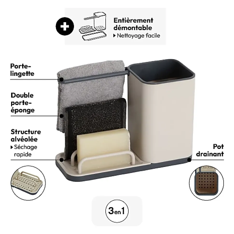 Organisateur d’évier « Néo » 4 en 1 beigeContenu : 1 organisateur évierDimensions : L. 21 x P. 9 x H. 14.5 cmColoris : BeigeMarque : 5 five simply smart