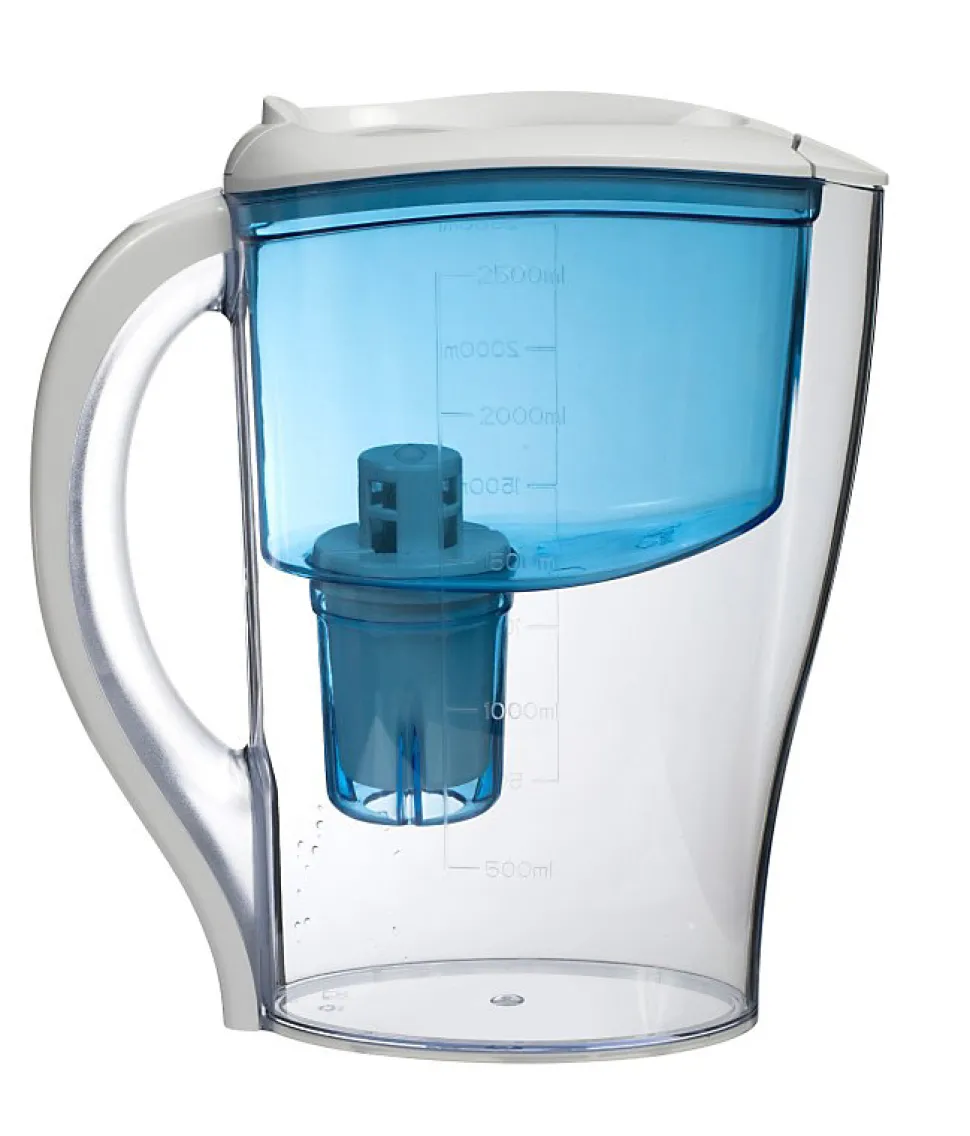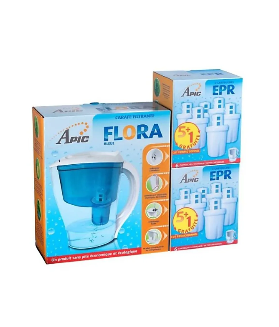 Carafe filtrante de couleur bleue et ses 12 cartouches de rechange 365 jours d’eau purifiée Supprime le mauvais goût et les odeurs dans votre eau. Empêche l’entartrage de votre bouilloire. La cartouche réduit fortement la teneur en plomb éventuellement présent dans l’eau de votre robinet. Indicateur calendaire Indiquez la date du changement de la cartouche pour vous rappeler de changer la cartouche chaque mois à la même date. Ce compteur ne nécessite pas de pile. Ergonomique Semelle anti-dérapante et poignée bi-matière pour une prise en main aisée et un bon maintien. Remplissage facile à une main par le haut de la carafe sans avoir à ouvrir le capot. La partie filtrante est détachable pour être nettoyée. Le pichet gradué vous permet de connaître la quantité d’eau filtrée. Eco-friendly La carafe se range idéalement dans la porte du réfrigérateur. Les courses sont simplifiées : vous n’avez plus à acheter, transporter et jeter des bouteilles en plastique. Comment ça fonctionne ? La carafe contient un filtre (cartouche) à placer très facilement. Suivre simplement les instructions. La cartouche constituée de charbon actif et de résine fonctionne par gravité. Comment choisir ma carafe filtrante ?