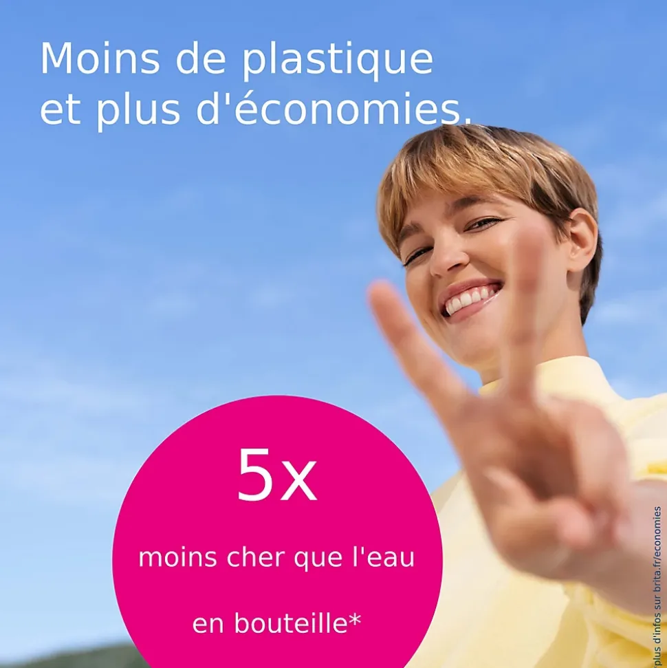 - *Si présents dans l’eau du robinet / **L’eau du robinet est conforme aux normes de potabilité / ***Plus d’informations sur brita.fr/economies / ****Si déposé dans un point de collecte participant / *****+50% de réduction du tartre par rapport à MAXTRA PRO Pure Performance