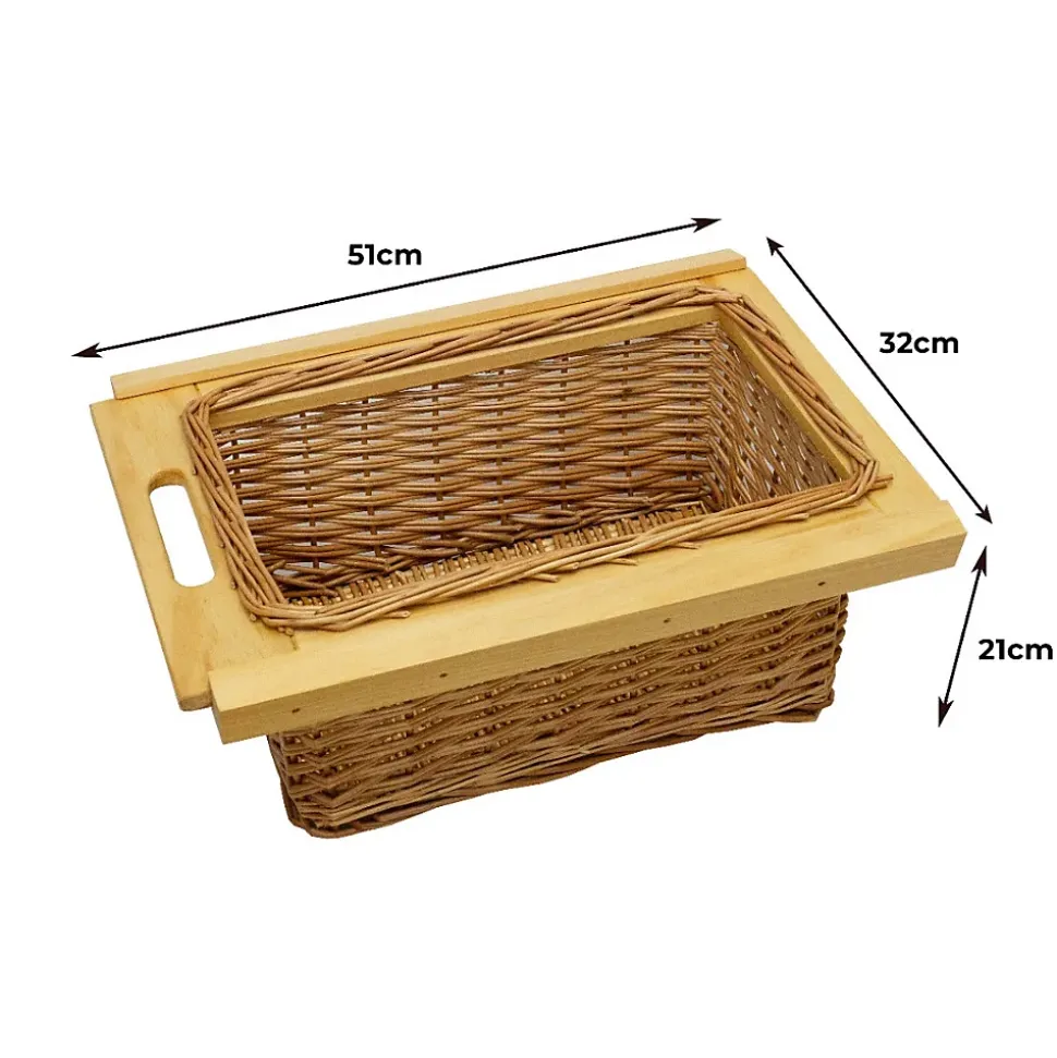 Ces luxueux paniers en osier tissés à la main offrent une touche rustique de rangement, parfaits pour une cuisine de style campagnard.Proposant une solution de rangement extrêmement pratique et idéale pour les cuisines, les chambres à coucher, la salle à manger ou encore la buanderie.Grâce à sa conception en osier, l’air peut facilement circuler, préservant ainsi la durée de vie des produits frais. Fabriqués à partir de hêtre et de rotin de haute qualité, ces paniers sont légers et durables à la fois tout en étant suffisamment solides pour accueillir une masse allant jusqu’à 10 kg par panier.Les patins en bois de plage pré-percés et le cadre avec poignée intégrée les rendent faciles d’accès dans les vitrines ouvertes.Le kit de fixation inclus GRATUITEMENT permet un ajustement rapide afin que vous puissiez commencer à organiser votre maison, votre cuisine ou votre garage immédiatement.Caractéristiques du Produit :Paniers en osier de hêtre et de rotin 100 % faits à la main.Paniers solides pouvant contenir une massant allant jusqu’à 10 kg par panier.Convient pour une armoire d’une largeur d’armoire de 40cm.Kit de fixation inclus GRATUITEMENT. Spécifications Techniques :Couleur : BrunMatériel panier : OsierMatériel patins : HêtrePoids par panier : 1,4KGDimensions extérieures panier :Profondeur : 510mm / 51cmLargeur : 320mm / 32cmHauteur : 210mm / 21cmDimensions intérieures panier :Profondeur : 389mm / 38.9cmLargeur : 229mm / 22.9cmHauteur : 210mm / 21cmLongueur patin : 485mm / 48.5 cmLargeur patin : 30mm /