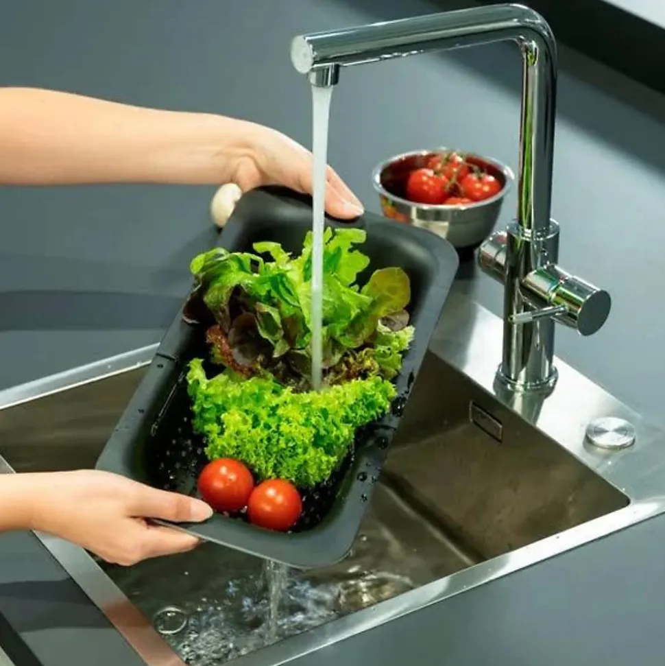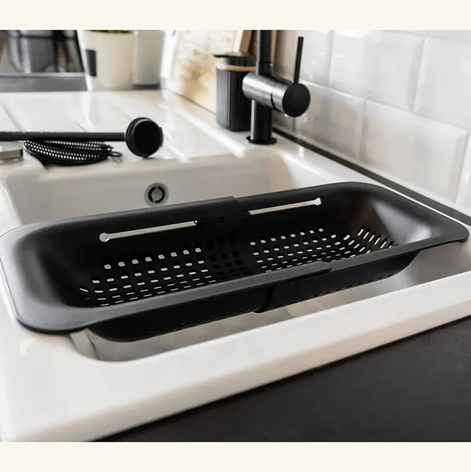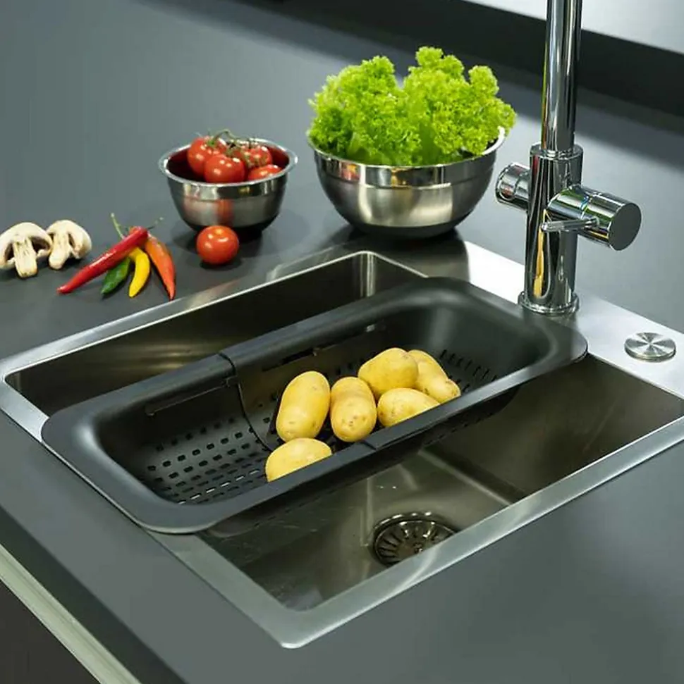 > Passoire astucieuse > Réglable en longueur > Idéal pour la préparation > Dimensions (LxHxl) : 36,5-50 x 7 x 20 cm