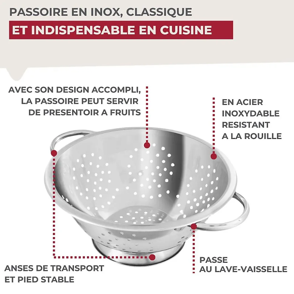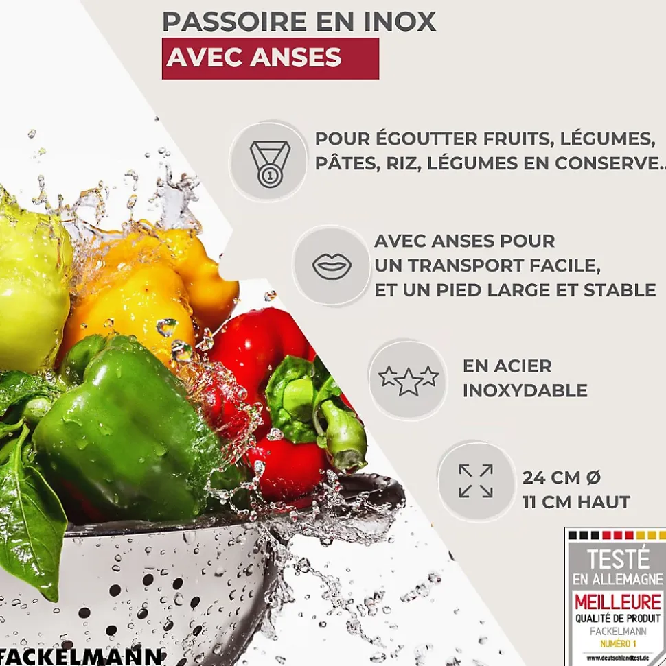 - DESCRIPTION : Fackelmann vous propose cette passoire en acier inoxydable, notre passoire possède deux anses afin d’être transportée facilement ; vous pouvez utiliser la passoire pour égoutter des fruits, des légumes, des pâtes, du riz
