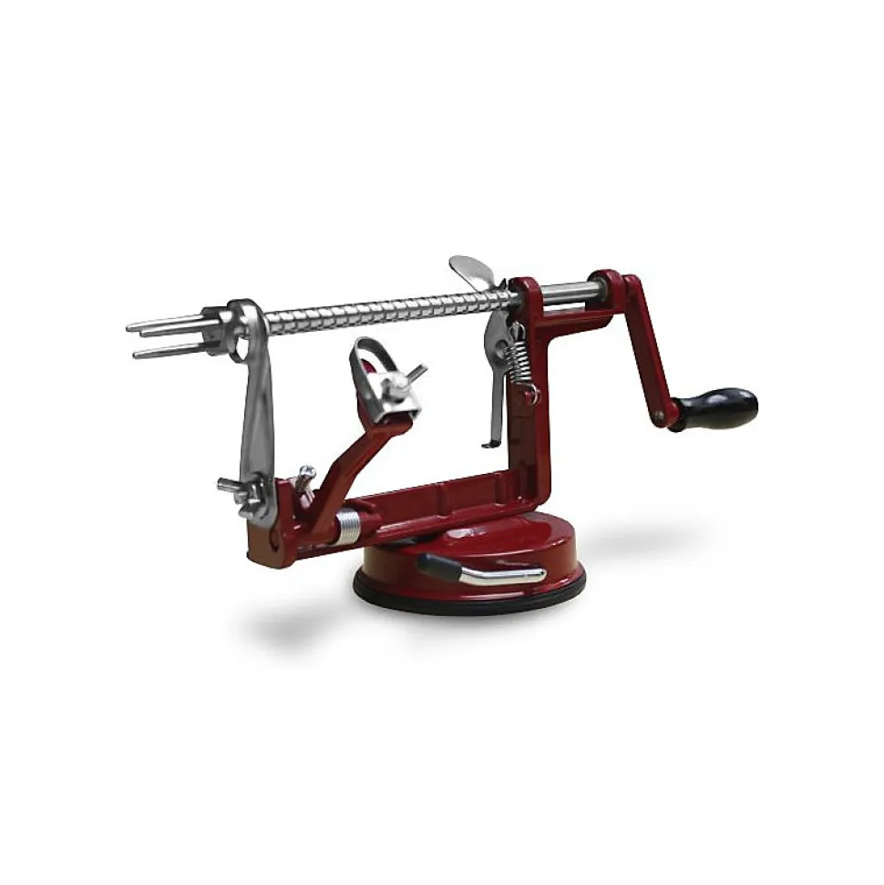 Pèle-pommes métal Baumalu – Idéal pour éplucher, évider et trancher en une seule opération – Matière : métalFixation par ventouseColoris : Bordeaux