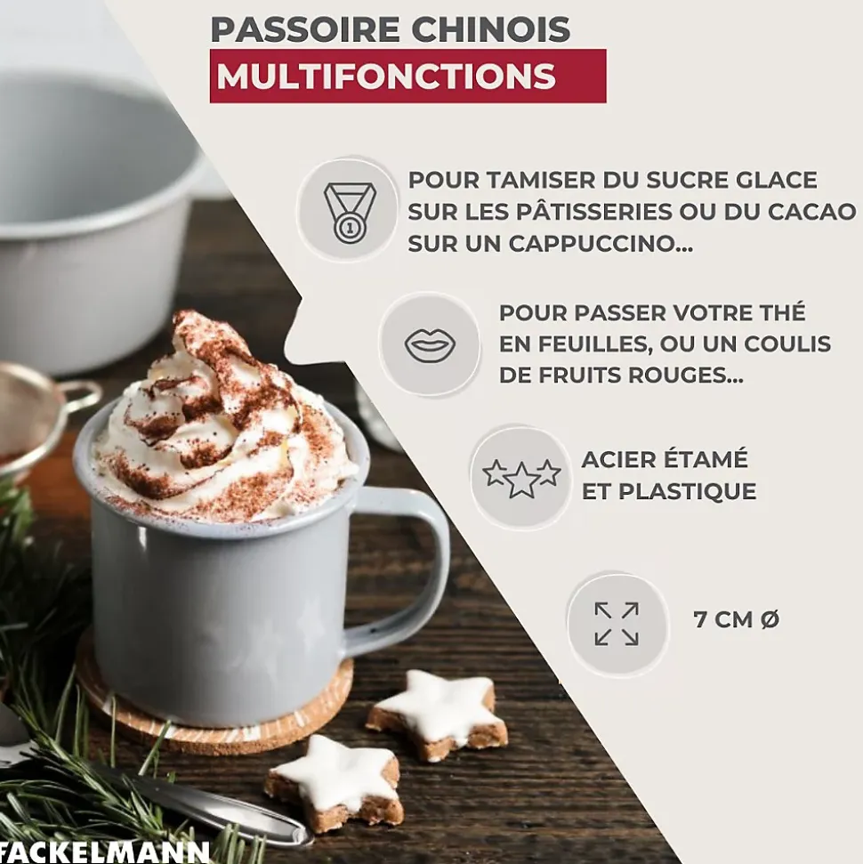 DESCRIPTION : Petite passoire chinois pour tamiser des poudres, comme de la farine et du cacao ; adéquat pour passer votre thé en feuille et vos infusions dans votre tasse à théLE PETIT + : Ce tamis est très précis pour tamiser du cacao ou du sucre glace sur une pâtisserie ou d’un café pour les décorerCOMPOSITION : Acier étamé, plastiqueDIMENSIONS : 7 cm de diamètreCONTENU : 1 passoire chinois, coloris aléatoire gris ou noirCette passoire est un ustensile classique de tous les amateurs de thé en vrac et de tisane en feuilles. Infusez dans votre théière et passez le liquide lors du service !Elle a l’avantage de faire également office de tamis, ce qui vous permet de tamiser facilement toutes les poudres : la farine, le cacao, le sucre et sucre glace, la poudre d’amandes pour décorer vos préparations.