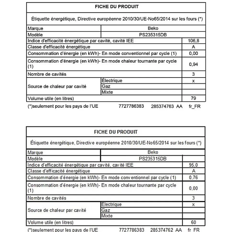 Piano de cuisson 170l 5 feux noir Beko – Piano de cuisson Beko PS235315DB comprenant une table de cuissn gaz et 3 fours électriques multifonctions. Multifour (3 fours) : Ce piano de cuisson est équipé de trois fours pour vous offrir une multitude de solutions de cuisson. Vous pouvez préparer en même temps une tarte, un rôti et de nombreux plats à des températures différentes, tout en évitant le mélange d’odeurs. Pour une solidité à l?épreuve du temps et un look moderne, les supports sont en fonte massive. Le foyer wok double couronne de 4000 W vous permet de saisir rapidement les plats quelle que soit leurs dimensions. Le gril électrique est indispensable pour cuire rapidement vos gratins et grillades. Beko s?engage à conserver les pièces détachées de cet appareil pendant 11 ans, à compter de la première date d?achat par lesconsommateurs. – Type de produit : Piano de cuisson dessus gaz.Indice d’efficacité énergétique (EEI cavité principale) : 95.Indice d’efficacité énergétique (EEI cavité 2) : 106.8.Classe énergétique cavité principale : A.Classe d’efficacité énergétique cavité 2 : A.Consommation d’énergie cavité principale en mode chaleur tournante (kWh/cycle) : 0.76.Consommation d’énergie cavité 2 en mode conventionnel (kWh/cycle) : 0.94.Nombre de cavités : 3.Source de chaleur par cavité : Electrique.Volume cavité principale (L) : 60.Volume cavité 2 (L) : 79.Volume cavité 3 (L) : 31.Piano de cuisson : Oui.Type de cuisinière : Gaz.Four multifonction : Multifonction.Programmateur : Oui.Ecran : Oui.Horloge : Oui.Couleur : Noir.Type de plaque : Gaz.Nbre foyer(s) : 5.Type de commandes : Manettes.Type d’allumage : Electronique intégré.Foyer le + puissant (W) : 3 000.Puissance totale des foyers (W) : 12000.Foyer wok : Oui.Sécurité gaz : Oui.Type de four : Electrique.Type de chaleur four : Convection naturelle.Commandes