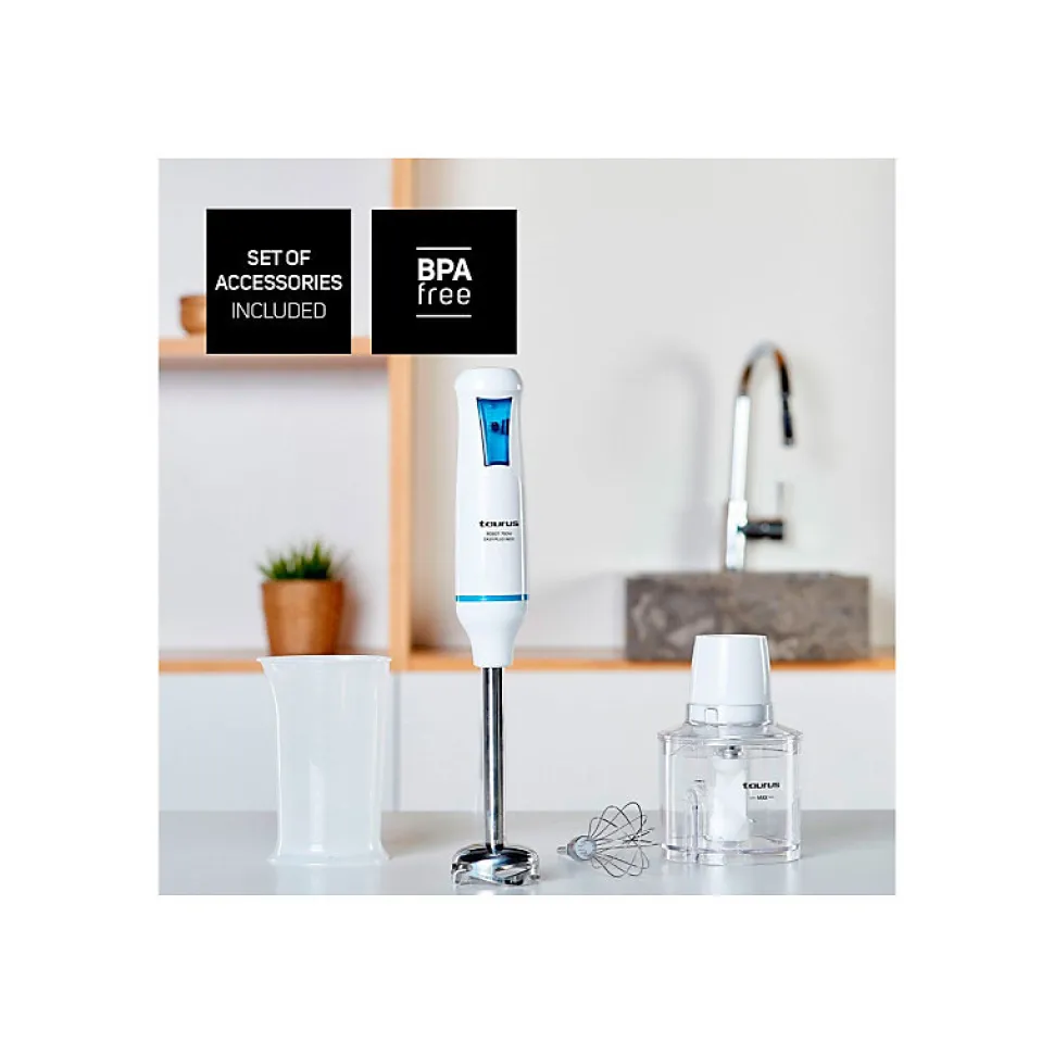 Le Pied mixeur Taurus ROBOT 750 PLUS INOX est un mixeur plongeant puissant de 750W avec lames en acier inoxydable et système Turbo Rotation. Design ergonomique et léger avec pied en inox anti-éclaboussures. Accessoires compatibles lave-vaisselle et sans BPA. Idéal pour soupes, purées, sauces et smoothies. Garantie 2 ans.