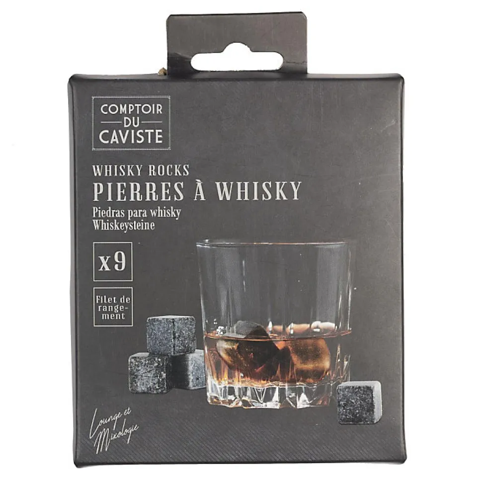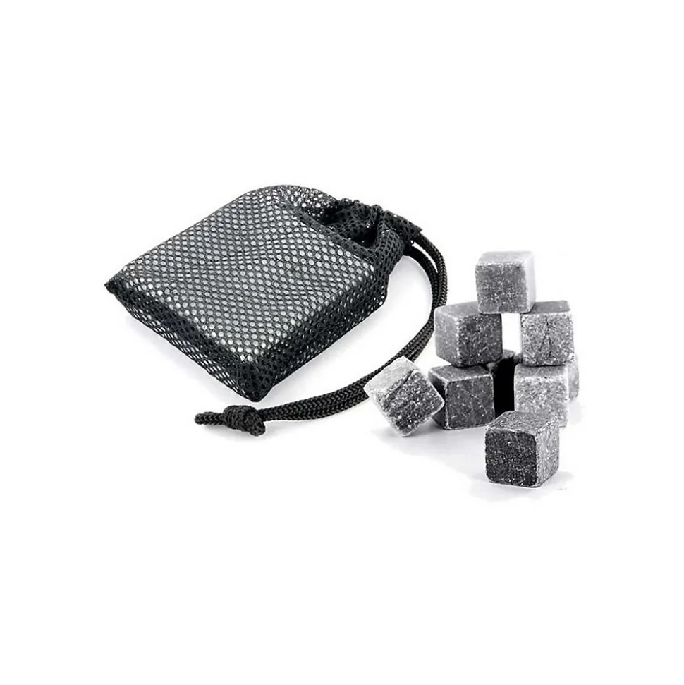 Aspect : Matériau principal = Pierre • Dimensions : Hauteur (en cm) = 2,00 • Longueur (en cm) = 2,00 • Profondeur (en cm) = 2,00 • Autres caractéristiques : Composition = 9 pierres à whisky 1 filet de rangement • Informations complémentaires = Permet de rafraichir les boissons sans les diluer • Poids (en kg) = 0,02 • Pierres à whisky avec filet de rangement