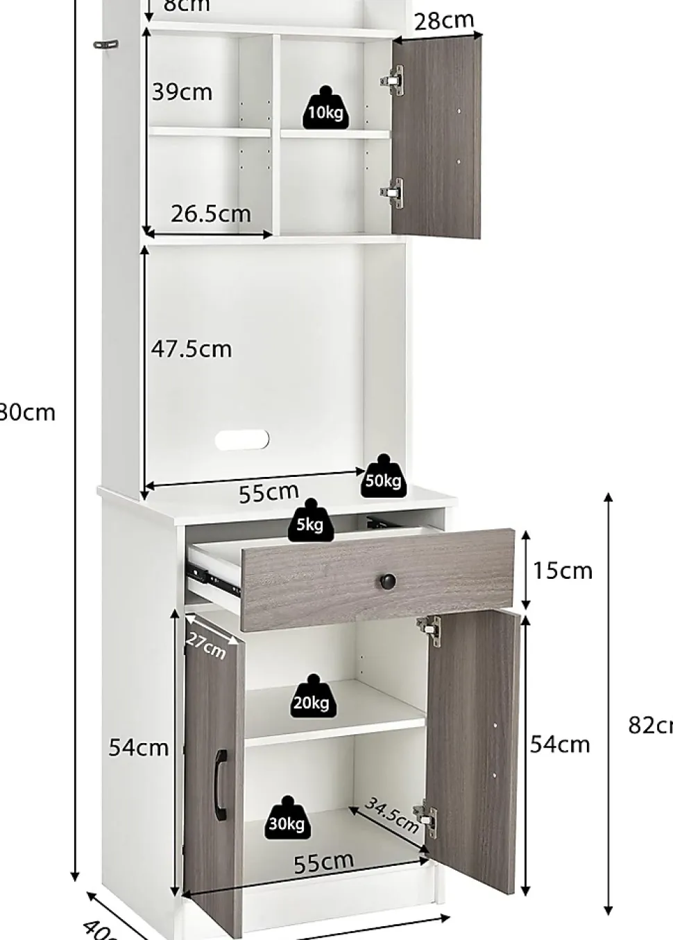 Couleur :Noir + Bois Dur / Blanc + Bois DurMatière : PB+ MDFDimension totale : 60 X 40x 180 cm (LxIx H)Capacite de poids de chaque etagere superieure: 10 kgCapacite de poids du comptoir : 50 kgCapacite de poids du tiroir:5 kgCapacite de poids de la tablette du bas reglable : 20 kgCapacite de poids de I’etagere du bas : 30 kgPoids net:37 kg