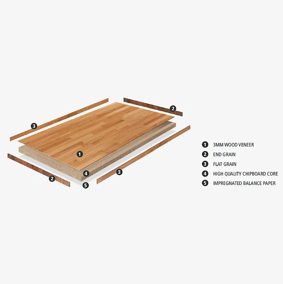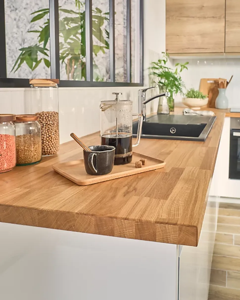 Plan de travail Chêne plaqué huilé, L.240 cm x l.63,5 cm, Ep.37 mmPlan de travail en chêne plaqué huilé, à la fois robuste et esthétique, pour un rendu naturel et chaleureux. Ses dimensions conviennent parfaitement aux cuisines et ateliers.Ce plan de travail est conçu avec un placage de chêne épais appliqué sur un panneau robuste, combinant beauté naturelle du bois et résistance.Sa fabrication multicouche réduit la sensibilité à l’humidité et les risques de déformation et de fissures liés au temps.Pré-huilé pour simplifier l’entretien et renforcer sa protection, tout en metant en valeur le bois, il peut également être poncé et traité pour prolonger sa durée de vie.