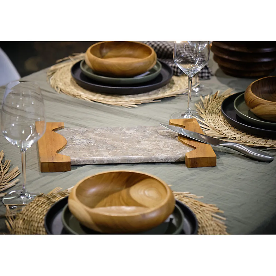 Découvrez la planche à découper ZEPHYR. Laissez-vous ravir par cette magnifique planche à découper en marbre et bois de teck ! Sophistiquée sans perdre sa solidité, cette planche à la forme unique sera un atout sur votre table. Les manches latéraux en bois de teck offrent une bonne prise en main. La planche en marbre quant à elle, offre noblesse et solidité, et ne craint pas le passage du couteau. L’association de ces matériaux fait de cette planche un outil robuste et élégant. Préparez vos repas et apéros en toute facilité, et n’hésitez pas à vous servir de la planche comme plateau de présentation et de service. Caractéristiques : Planche à découper ZEPHYR. COULEUR : Marbre gris. COMPOSITION : Marbre et bois de teck. TECK : Un bois exotique précieux, résistant et imputrescible. Son grain est serré et fin. Une caractéristique unique fait que le teck ne provoque pas de corrosion ni d’oxydation du métal à son contact. MARBRE : Un matériau noble et résistant, connu pour son élégance et sa durabilité exceptionnelle. DIMENSIONS APPROXIMATIVES : Hauteur 2 cm x Longueur 38 cm x Profondeur 22,5 cm / Épaisseur marbre 1,5 cm. ATTENTION : En raison du caractère artisanal et unique, la couleur et l’aspect du bois peuvent varier par rapport au produit présenté sur les photos. Nettoyer délicatement avec un chiffon doux et eau savonneuse. Ne pas utiliser de produits ou accessoires abrasifs. Utiliser des produits adaptés à la nature du bois. Il est déconseillé de mettre la planche au lave-vaisselle. 1 Colis : 0.9 kg.