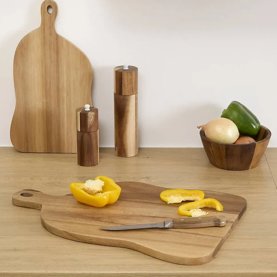 Alliant l’authenticité du bois brut et un design fonctionnel, cette planche à découper en acacia devient un indispensable de votre cuisine. Préparez vos repas quotidiens ou présentez vos plus beaux apéritifs avec élégance. Conçue entièrement en acacia, un bois réputé pour sa solidité, cette planche de la collection Acacia Cuisine par 5 Five Simply Smart apporte une touche chaleureuse et naturelle à votre plan de travail. Sa forme douce et son manche pratique en font un objet aussi beau qu’utile, qui trouvera sa place suspendu dans votre cuisine ou simplement posé comme élément de décoration. Description Matière : 100% acacia Manche ergonomique avec trou pour faciliter la suspension et le rangement Design aux lignes organiques pour une présentation soignée Dimensions L 35 x l 20 x H 1,5 cm Qualité Ce produit est garanti 2 ans.