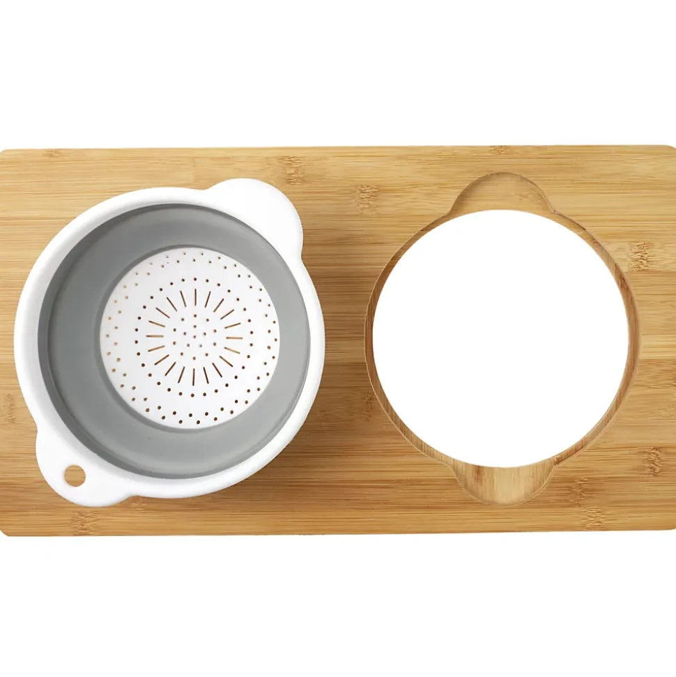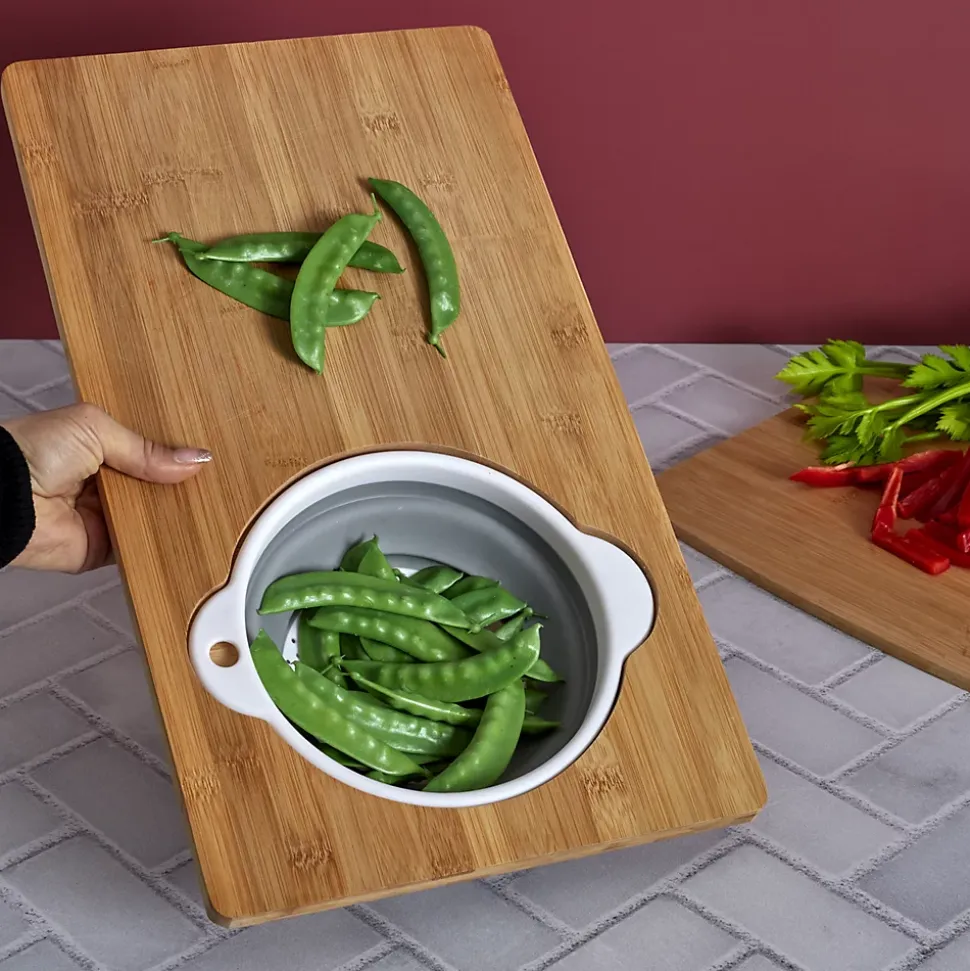 Aspect : Matériau principal = Bambou • Matériaux secondaires = Silicone • Dimensions : Hauteur (en cm) = 2 • Longueur (en cm) = 49,50 • Profondeur (en cm) = 29,50 • Autres caractéristiques : Informations complémentaires = Passoire amovible intégrée • Poids (en kg) = 1,12 • Planche à découper en bambou avec passoire intégrée