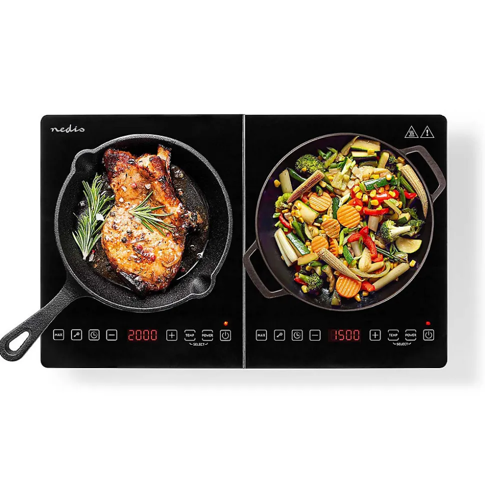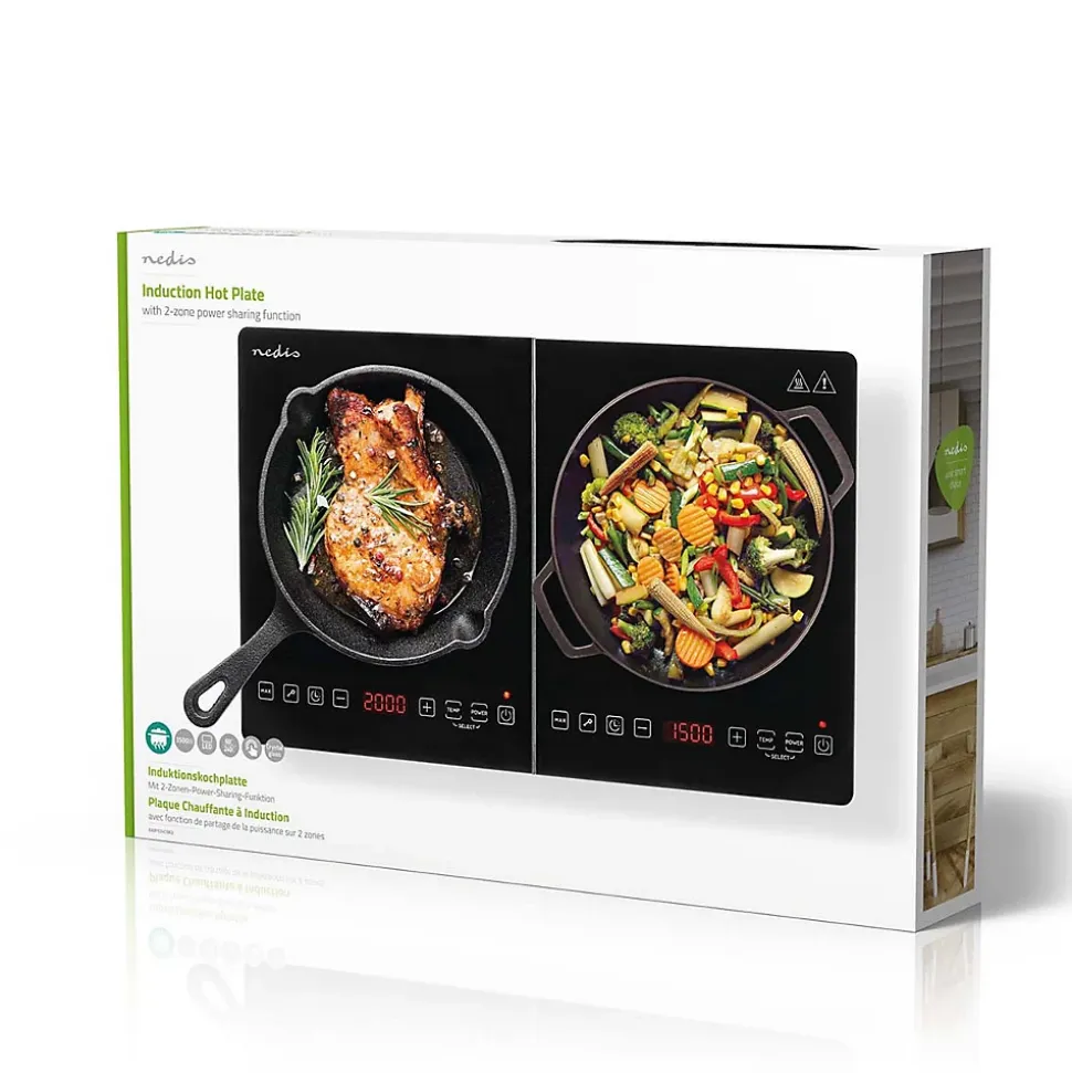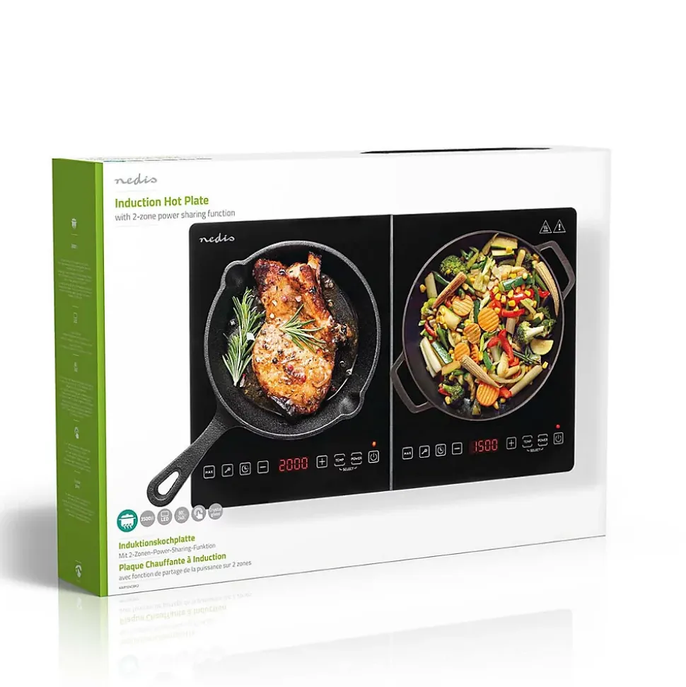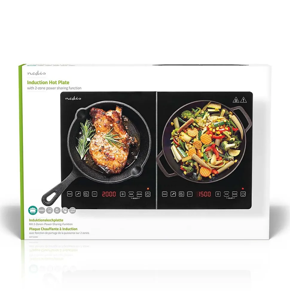 Description du produitAgrémentée d’un design noir brillant et d’une surface de cuisson de 12-26 cm par zone, cette plaque chauffante à induction avec 2 zones Nedis possède une puissance maximale de 2 000 watts si vous n’utilisez qu’une zone. Ce produit se démarque particulièrement par sa fonction de partage d’alimentation. Ainsi, lorsque vous utilisez les deux zones en même temps, celles-ci partagent une puissance maximale de 3 500 watts. Vous pouvez régler la température, la puissance et la minuterie grâce à l’écran tactile numérique qui s’affiche pour chaque zone sur l’écran LED à 4 chiffres. La plaque chauffante à induction propose 10 niveaux de température pour chaque zone chauffante, allant de 60 °C à 240 °C, pour vous aider à maintenir la plaque à une température constante. Elle possède également 10 niveaux de puissance, de 300 à 2 000 watts, pour une chauffe rapide. La minuterie est réglable de une à 180 minutes.Pour une plus grande sécurité d’utilisation, la plaque chauffante s’éteint automatiquement lorsque vous retirez la casserole. Elle est également dotée d’une protection contre la surchauffe et d’une reconnaissance automatique des casseroles, qui éteint automatiquement le produit si la casserole n’est pas adaptée. Ses solides pieds antidérapants permettent d’éviter tout déplacement sur le plan de travail. De plus, le produit est doté d’une plaque en verre non poli qui permet un nettoyage rapide et facile.Caractéristiques Élégante plaque chauffante au design noir brillant avec 2 zones et écran LCDDeux plaques à induction adaptées aux poêles et casseroles à inductionReconnaissance des casseroles : arrêt automatiqueCommande tactile par capteur avec écran LED à 4 chiffresPlage de température 60 °C-240 °C, et minuterie de 180 minPlaque en verre non poli : nettoyage rapide et facileProtection contre la surchauffe pour une s