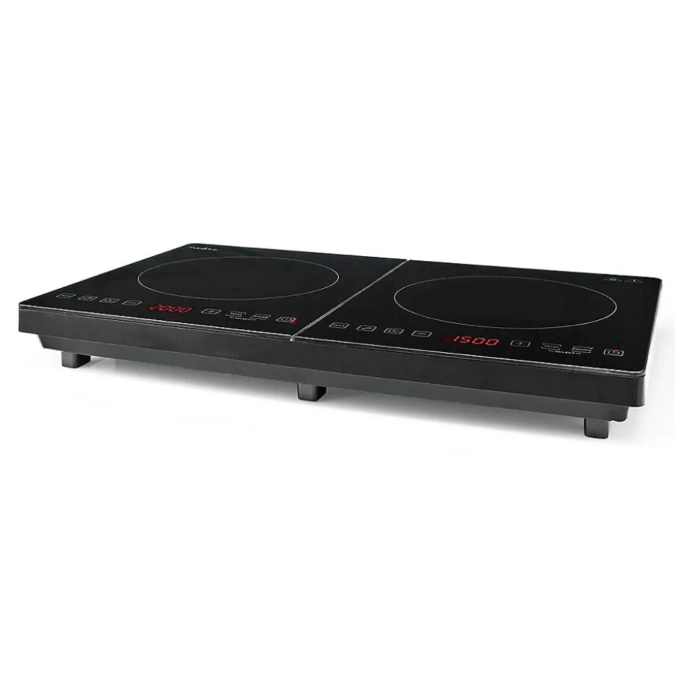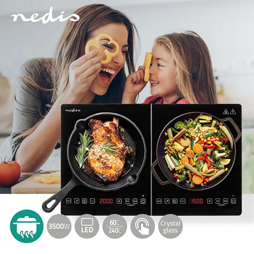 Plaque de cuisson induction Nedis 2 feux 3500 W (2 x 1750 W) combine puissance, précision et sécurité. Température de 60 à 240°C. Minuteur jusqu’à 180 minutes, fonction turbo, verrouillage enfants et protection contre la surchauffe. Panneau tactile LED, design compact et sa compatibilité avec toutes casseroles induction en font la plaque idéale pour la maison, le camping ou les petits espaces. Dimensions : 35 x 56.2 x 62 cm
