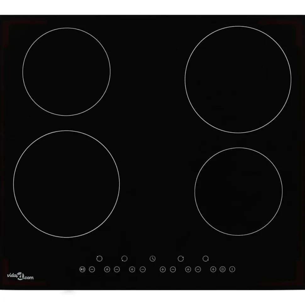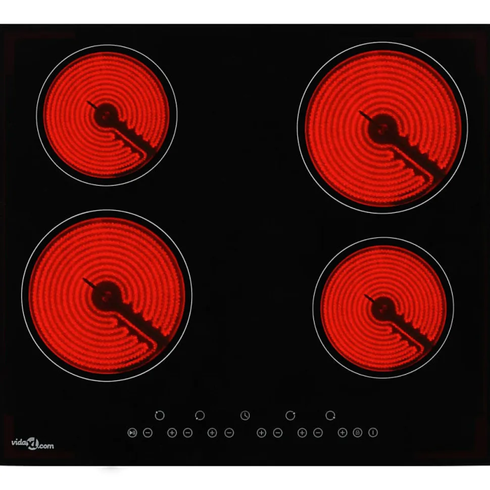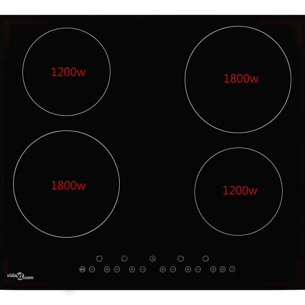 Plaque de cuisson céramique 4 brûleurs avec contrôle tactile, puissance totale de 6000 W, surface en verre résistant à la chaleur, 9 niveaux de cuisson, fonctions avancées de sécurité et minuterie individuelle.