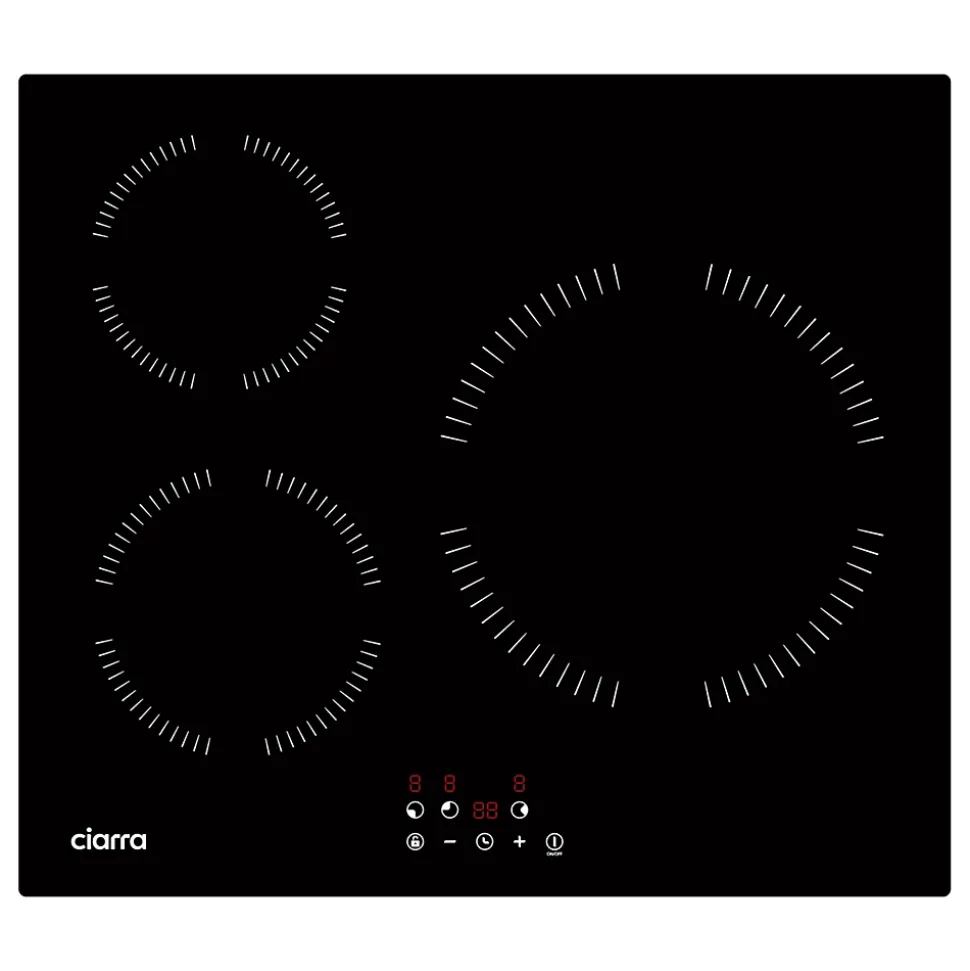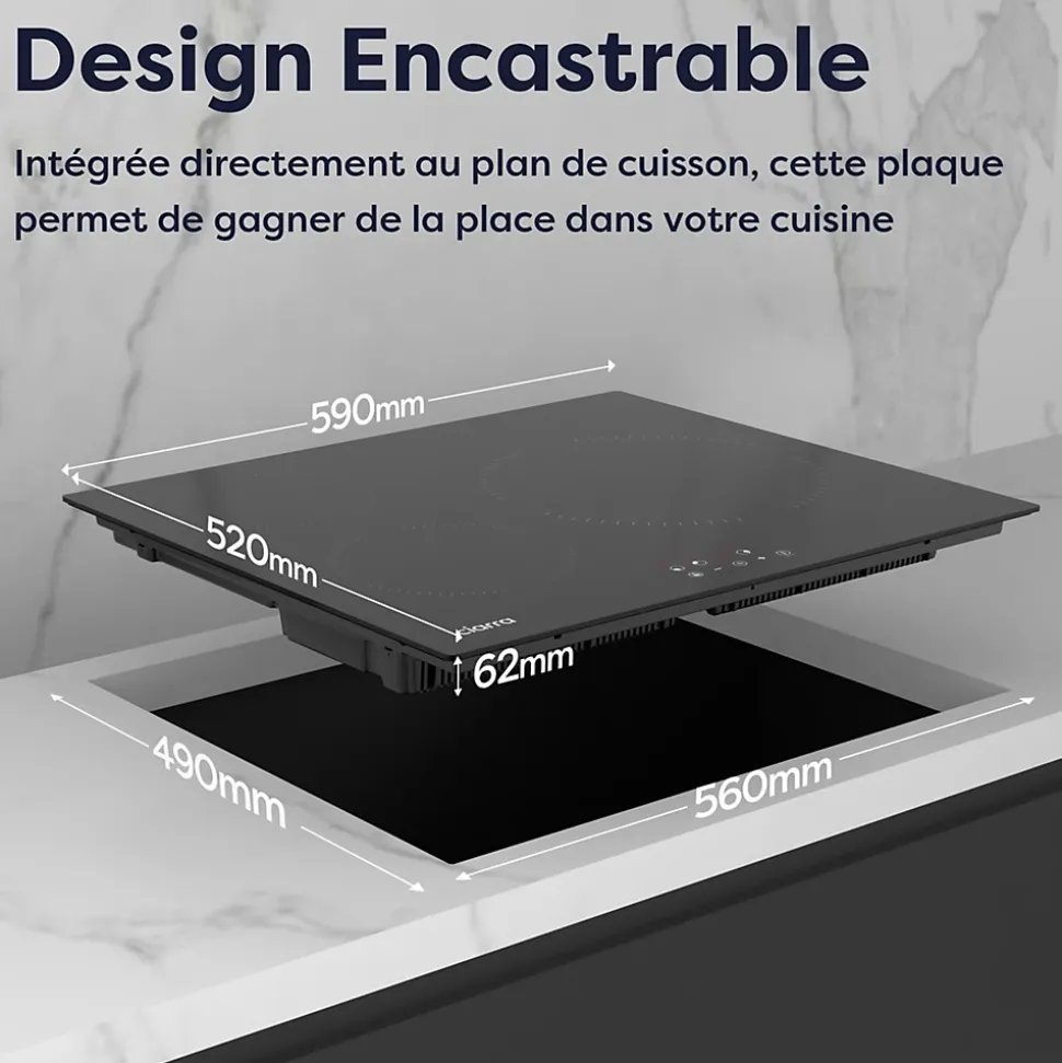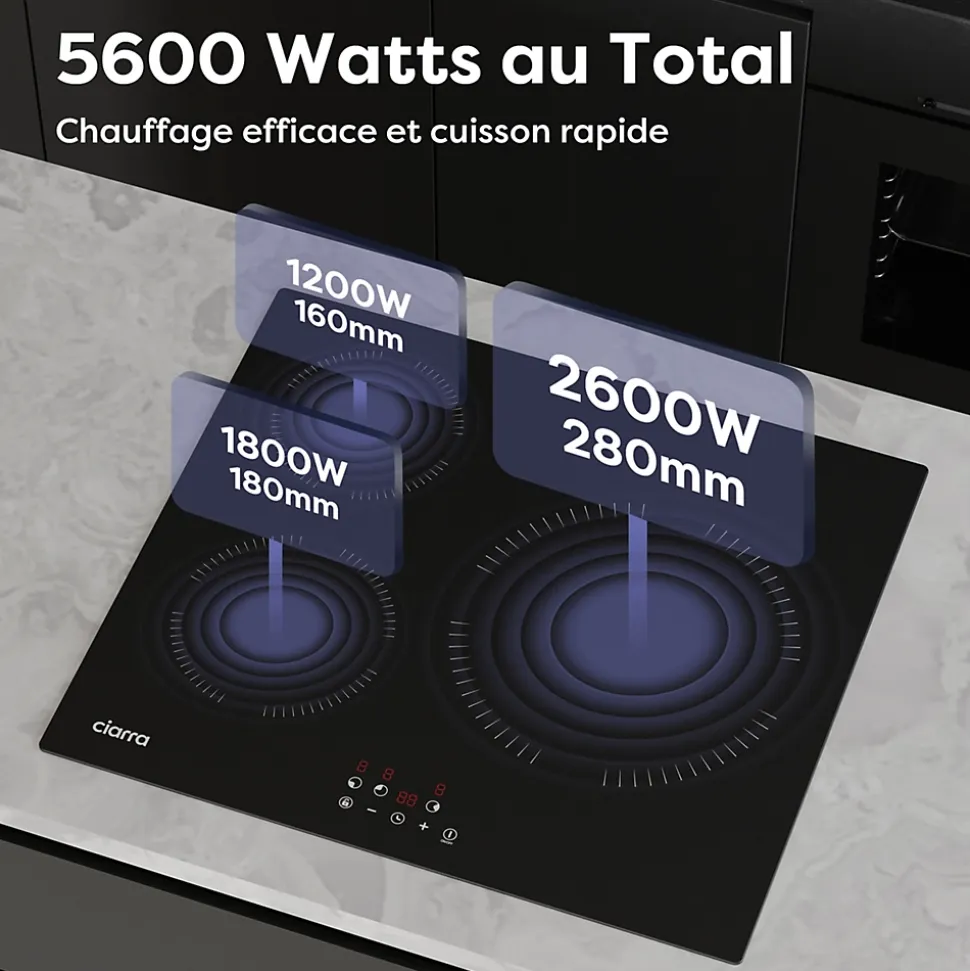 Modèles: CD3BIH-APanneau Givré Légèrement BrillantType : Plaque à induction encastrableNombre de foyer:3 feuxNiveaux de Puissance: 9Puissance totale: 5600 WattBooster: NonCommande: Touche Sensitive avec Affichage DigitalPrise:San priseAlimentation : 220-240V ~ 50-60HzDimensions (LxPxH) : 59 x 52 x 6.2 cmDimensions d’encastrement : 56 x 49 x 8 cmPuissance et diamètre des zones :Zone Avant Gauche: 180mm,1800W (Compatible avec les casseroles de fond de 140-260mm)Zone Arrière Gauche: 160mm,1200W (Compatible avec les casseroles de fond de 120-200mm)Zone Arrière Droite: 280mm,2600W (Compatible avec les casseroles de fond de 180-300mm)Fonctions :Minuterie individuelle pour chaque foyer (jusqu’à 99 minutes)Verrouillage enfantIndicateur de chaleur résiduelle (« H »)