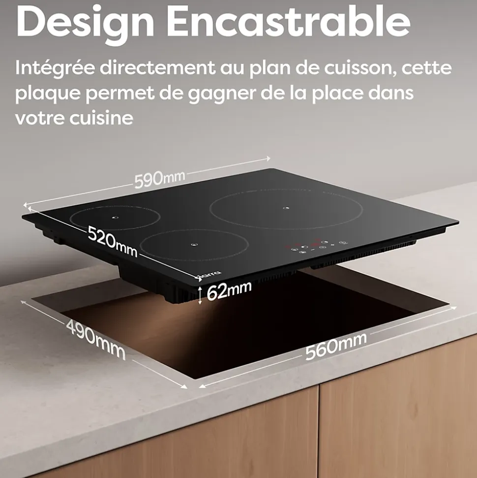 La plaque induction CD3BIH-E est idéale pour une cuisson quotidienne efficace :Puissance totale 5600W : Répartition équilibrée sur 3 zones (1800W/1200W/2600W).Protection complète : Verrouillage enfant, sécurité anti-débordement et détection automatique les casserolesDimensions compactes : 590x520x62mm, intégration harmonieuse dans votre cuisine.