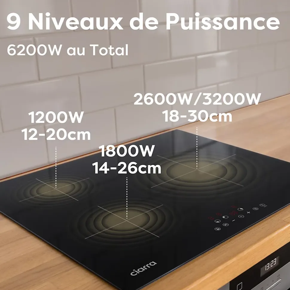 CIARRA CD3BIH Plaque de cuisson induction avec 3 zones de cuisson, s’adapte aux divers types de casseroles. Surface en verre noir rend un style cool et élegant pour votre cuisine, qui est facile à nettoyer et maintenir.9 niveaux de puissance dont 6200W au total, fonction boost sur le grand foyer,permet de sélectionner précisément la température souhaitée. Commandes sensitives avec affichage digital pratique à opérer.Elément de chauffage en Induction et surface en vitrocéramique, maximer l’éfficacité d’énergie jusqu’à 90%, les casseroles contactenet directement dans la zone de cuisson, rechauffent rapidement tout en réduisant les pertes de chaleur et gagne du temps.Sécurités en 8 NiveauxDétail : Témoins de mise sous tension, Témoins de chaleur résiduelle, Sécurité enfants, Auto-Stop, Détection des récipients, Système de débordement, Fonction Pause, Minuteur