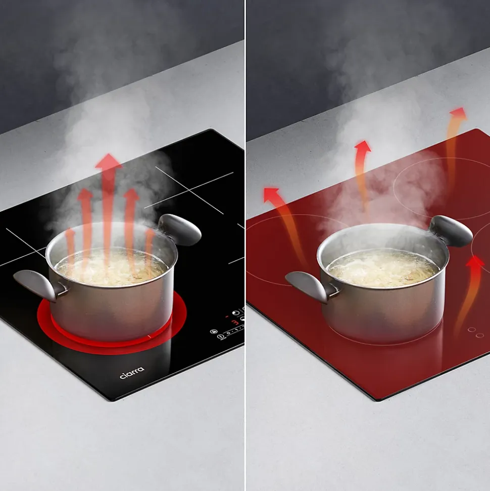 CIARRA CD4BBIH Table de cuisson induction – 4 Foyers à grande capacité, opération facile par les Commandes sensitives & Slider.9 Niveaux de puissance – 7200W au total, convient aux différents aliments et méthodes de cuisson.Booster individuel sur chaque zone – permet de chauffer une zone à puissance plus grande pour une durée de 5 minutes.Haute Efficacité d’énergie – Les casseroles contactent directement dans la zone de cuisson vitrocéramiqu, rendant une éfficacité d’énergie max jusqu’à 90%, réduisent les pertes de chaleurs pendant la cuisson.Grande facilité d’utilisation – S’adaptent aux différentes tailles de ustensiles de cuisine, qui vous permettent de préparer plusieurs plats en même temps, un vrai atout pour la famille.Utilisation en Sécurités7 Niveaux : Témoins de mise sous tension, Indicateur de chaleur résiduelle, Sécurité enfants, Auto-Stop, Détection des récipients, Système Anti-débordement, Minuteur