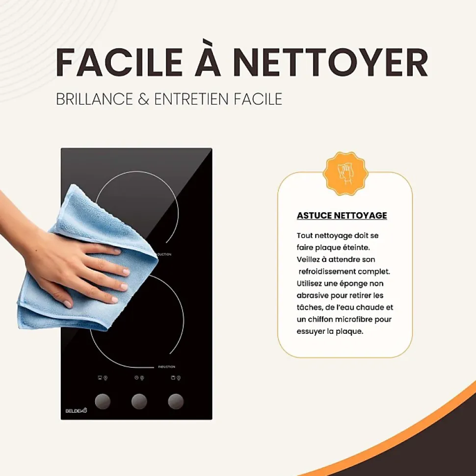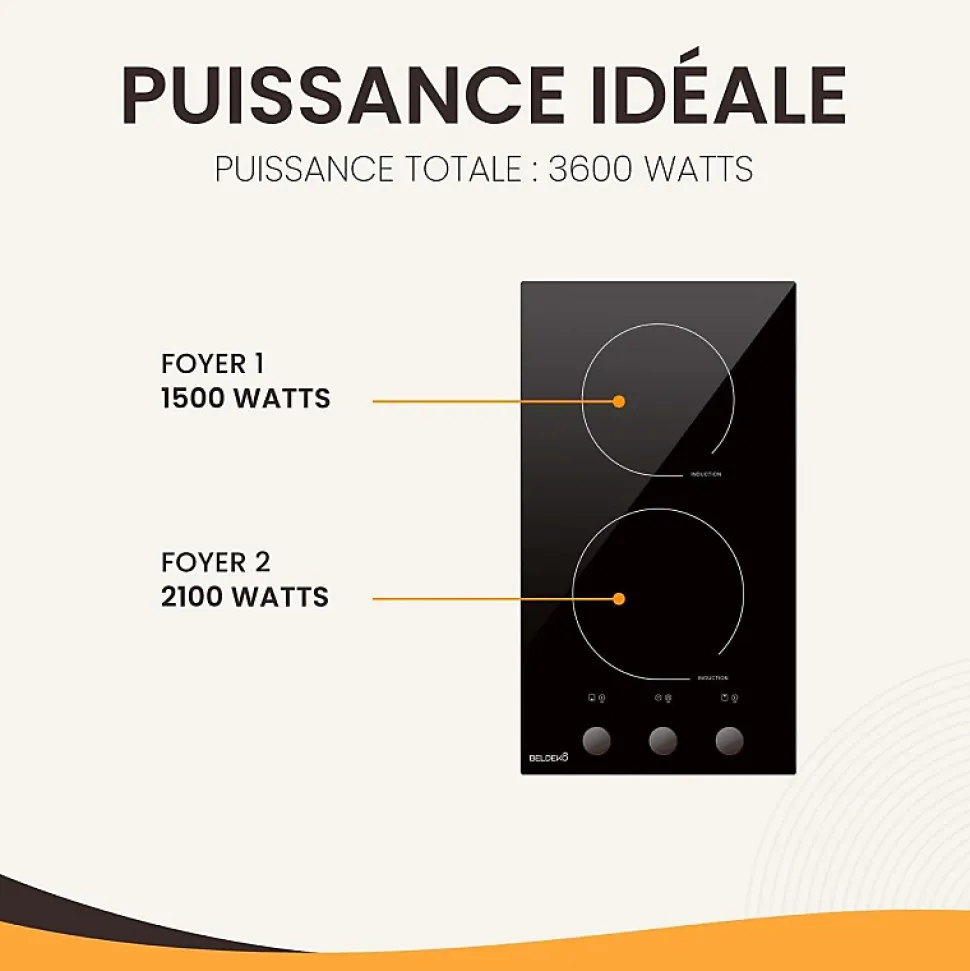 Plaque induction encastrable 2 foyers, puissance totale 3600 W. Commandes par boutons physiques pour une utilisation simple et intuitive. Chaque foyer dispose d’un minuteur intégré pour une cuisson précise.