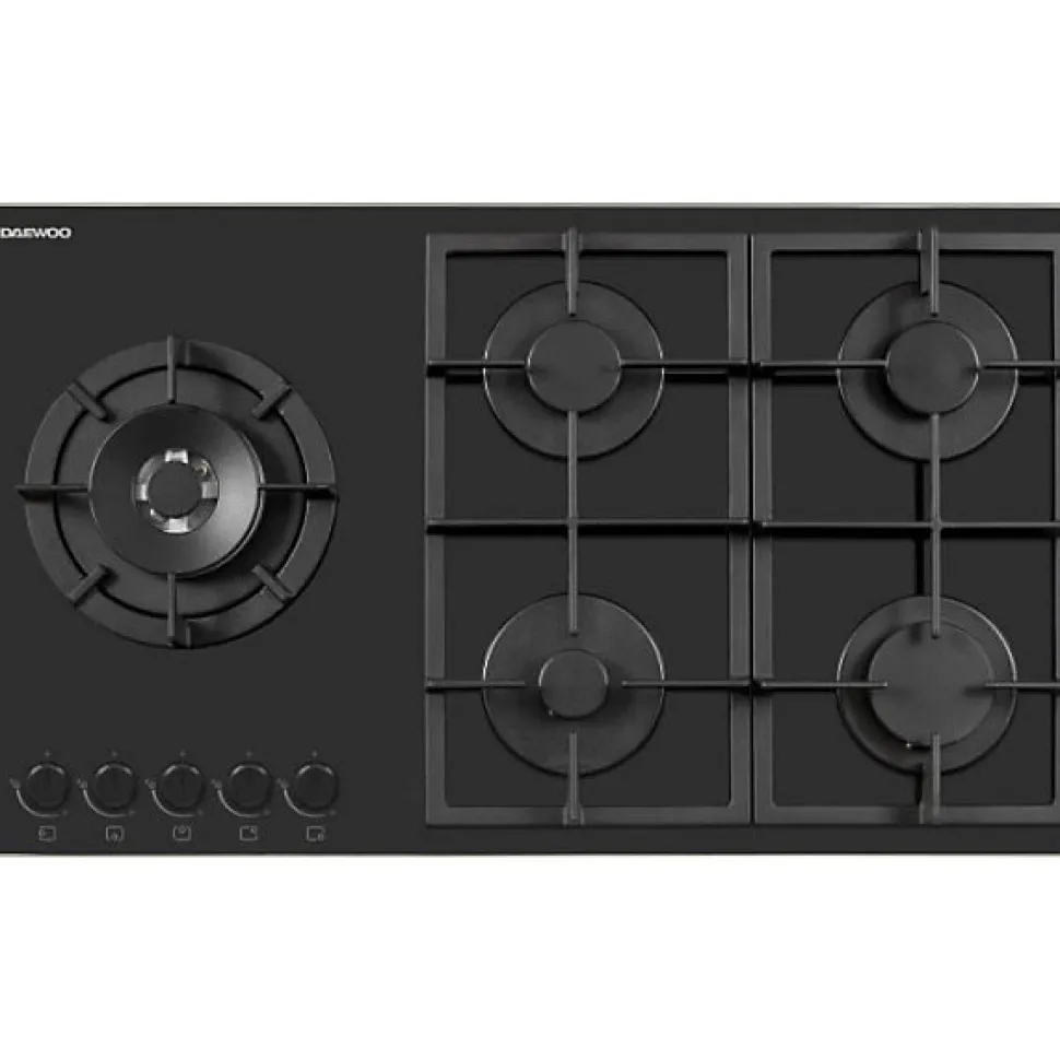 Plaque de cuisson gaz encastrable Daewoo 90 cm, 5 foyers, surface verre noir, brûleur wok 4500 W, puissance totale 12 000 W, commandes boutons et timer intégré.