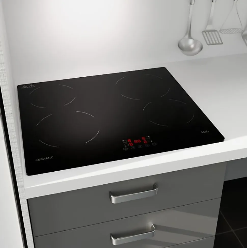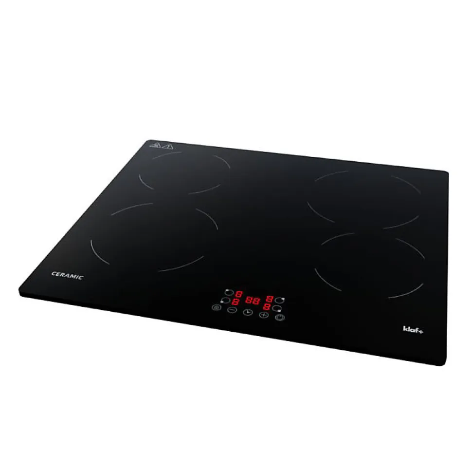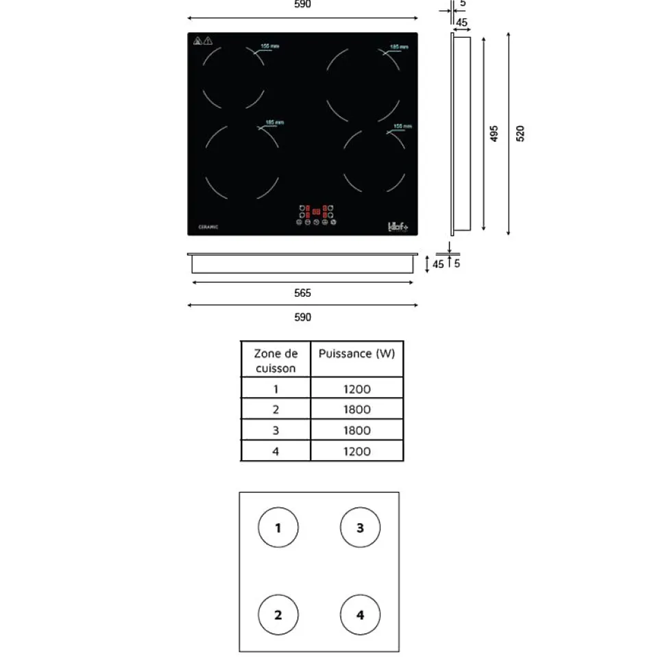 Alliant design moderne, performance et simplicité d’utilisation, la plaque vitrocéramique 4 feux KLAF est conçue pour une expérience culinaire optimale. Avec ses fonctionnalités avancées et ses zones de cuisson polyvalentes, elle répond à tous vos besoins, du mijotage délicat aux cuissons intenses. Les atouts de la plaque vitrocéramique 4 feux KLAF Chauffage rapide et précis : Une montée en température efficace pour une cuisson homogène et maîtrisée. Zones de cuisson polyvalentes : Adaptées à tous types de préparations, elles offrent une grande flexibilité d’utilisation. Design élégant et pratique : Une surface vitrocéramique raffinée qui s’intègre parfaitement dans toutes les cuisines. Entretien facilité : Une surface lisse et résistante qui se nettoie en un geste. Sécurité avancée : Fonctionnalités de sécurité intégrées pour une utilisation en toute sérénité. Interface intuitive : Un panneau de commande simple et ergonomique pour un confort d’utilisation optimal. Caractéristiques principales de la plaque de cuisson vitrocéramique 4 feux KLAF : Type de plaque : Vitrocéramique Intensité : 32 A Zones de cuisson : 4 Puissance totale : 6000 W Dimensions (L x l x H) : 590 x 520 x 50 mm Dimensions d’encastrement (L x l) : 565 x 495 mm Tension : 230/240V Fréquence : 50/60Hz Alimentation : raccordement électrique par câble (sans prise) Garantie : 3 ans* Détails des zones de cuisson : Zone 1 : 155 mm – 1200 W Zone 2 : 185 mm – 1800 W Zone 3 : 185 mm – 1800 W Zone 4 : 155 mm – 1200 W Fonctionnalités : Minuteur intégré pour une cuisson maîtrisée Sécurité enfant /