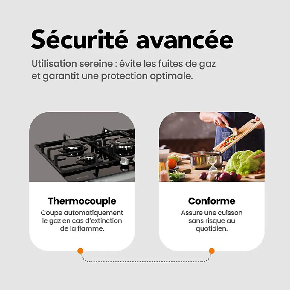 - Matière : Surface en verre athermique – Grilles et chapeaux de brûleur en fonte noire