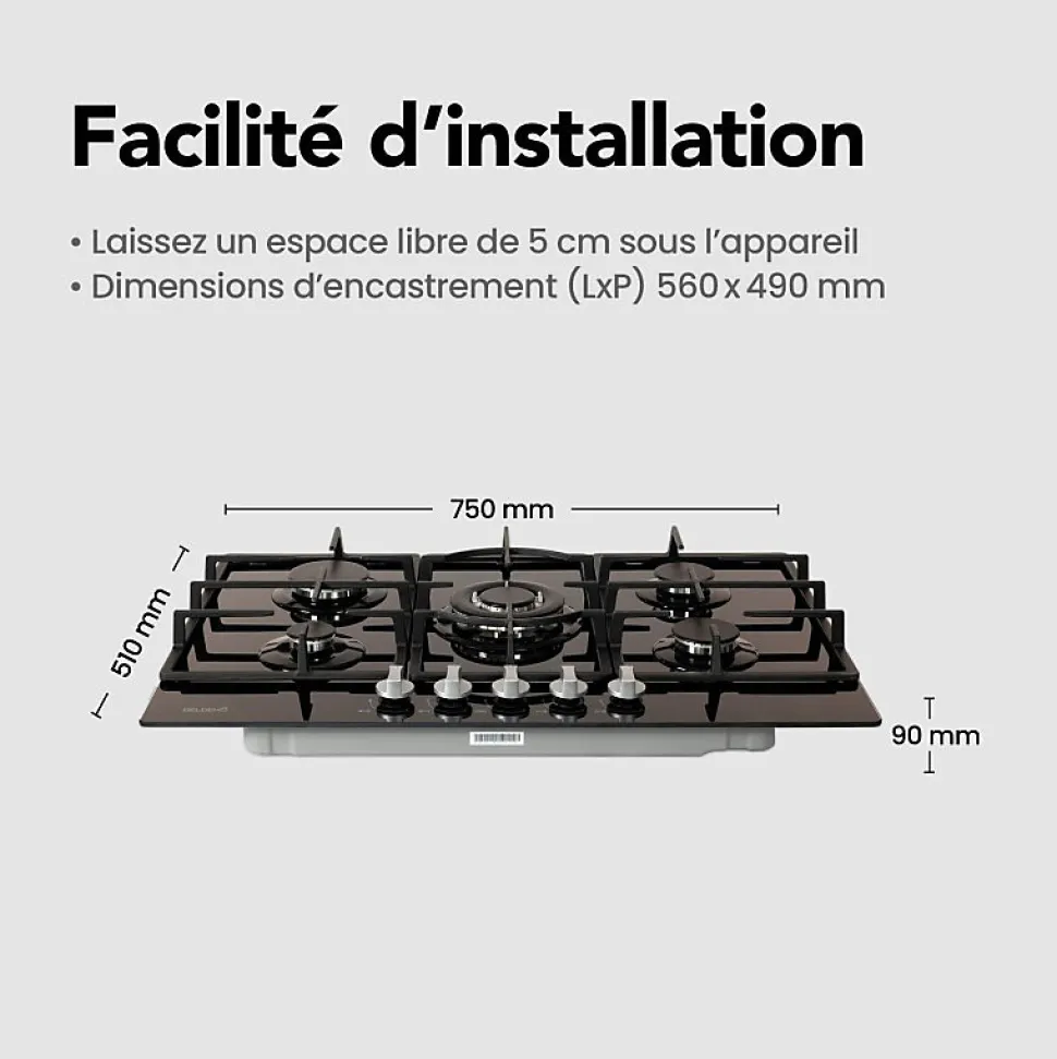 - Plaque gaz 5 foyers en verre noir, compacte et performante. Encastrement standard 56 x 49 cm pour remplacer une 3 ou 4 foyers sans modifier le plan de travail.