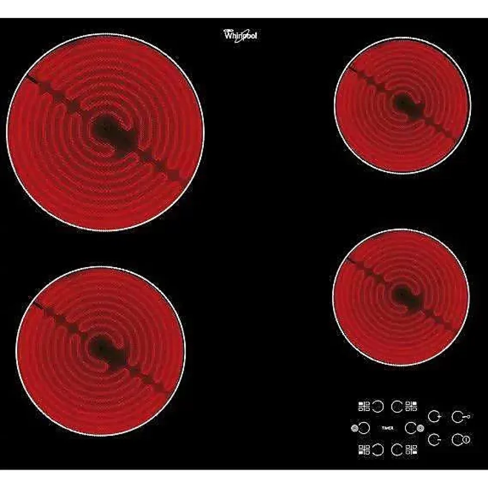 Plaque vitrocéramique Whirlpool AKT8090LX avec 4 zones de cuisson radiant de puissances variées (1700 W, 2100 W, 2×1200 W), commandes tactiles frontales pour un accès intuitif, sécurité enfant, indicateurs de chaleur résiduelle et minuterie intégrée. Dimensions compactes (58×51 cm) avec cadre inox et surface en verre noir facile à nettoyer. Idéale pour une cuisson précise et sécurisée.