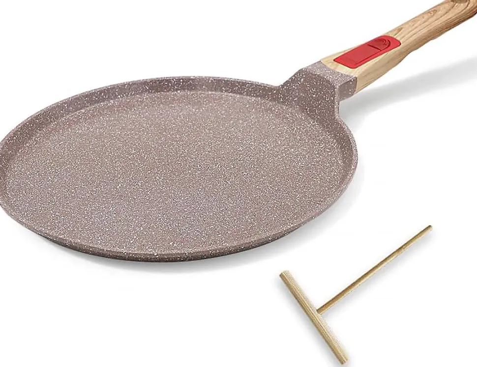 Cette poêle de 25 cm est idéale pour préparer des crêpes, pancakes, roti tawa, ainsi que pour faire frire œufs, bacon, saucisses et bien plus, parfaite pour le petit-déjeuner ou le goûter. Son revêtement en céramique sain est antiadhésif, 100 % exempt de PFAS et de PFOA, et se nettoie facilement à l’eau avec une éponge douce ou un chiffon. La poignée ergonomique reste froide et confortable, réduisant le risque de brûlure, et peut être retirée pour un rangement pratique. Compatible avec toutes les cuisinières, il est recommandé de cuire à feu doux et de laver la poêle à la main pour préserver le revêtement.