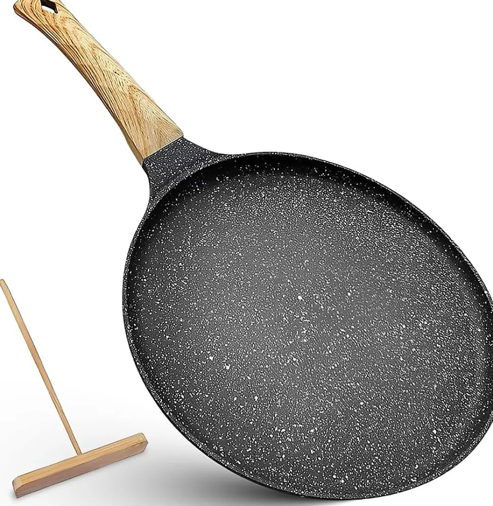 Cette poêle est idéale pour préparer des crêpes, pancakes, crêpes françaises, ainsi que pour rôtir des œufs, du bacon, des saucisses et bien d’autres plats, parfaite pour le petit-déjeuner ou le goûter. Son revêtement antiadhésif de qualité supérieure est 100 % sans PFOA et permet de retourner et de retirer les aliments facilement sans effort. La poignée ergonomique reste froide et confortable, protégeant vos mains des brûlures et assurant une expérience de cuisson sûre. Compatible avec toutes les sources de chaleur, y compris l’induction, il est conseillé de cuire à basse température pour préserver le revêtement. Le kit comprend une crêpière de 28 cm et un répartiteur de pâte en bois pour obtenir des crêpes parfaitement uniformes.