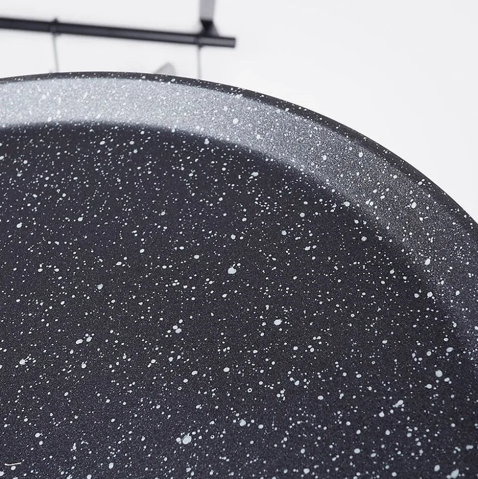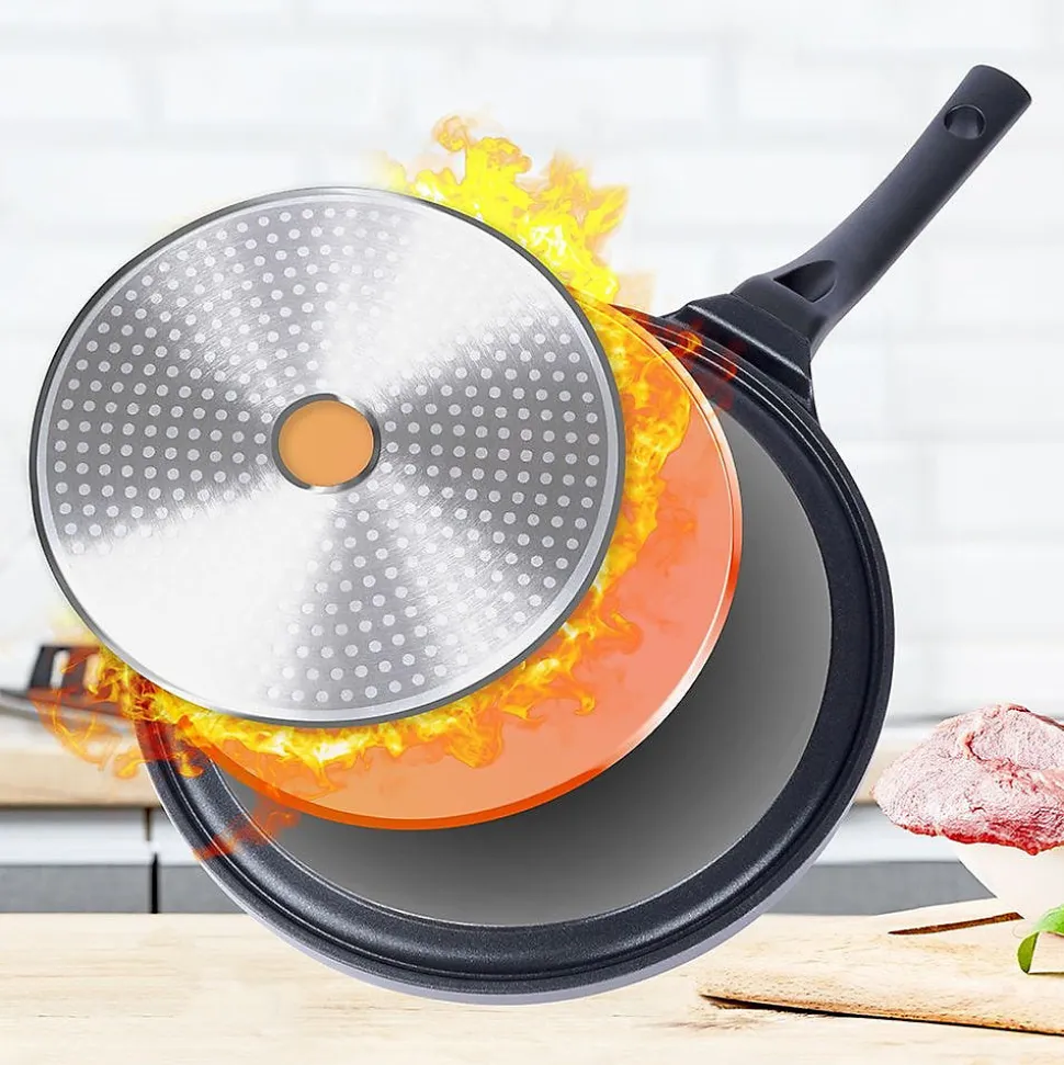 La poêle à crêpes GRANDE granit est une pièce robuste en aluminium moulé, conçue pour les amateurs et les professionnels qui recherchent une cuisson uniforme et sans accroche pour les crêpes, galettes et omelettes. Caractéristiques Revêtement granit antiadhésif sans PFOA ni PTFE Matériau: aluminium moulé, solide et durable Diamètre extérieur: 26 cm Dimensions externes: longueur 47 cm, hauteur de la poêle 1,5 cm, hauteur avec la poignée 7 cm Poignée: en matériau durable et résistant, reste froide au toucher Compatibilité chaleur: gaz, électrique, céramique, halogène et induction Entretien: compatible lave-vaisselle Utilisation: idéale pour crêpes, galettes et omelettes Avantages Cuisson rapide et homogène: la répartition uniforme de la chaleur améliore la cuisson et réduit les temps de préparation Réduction de la matière grasse: le revêtement granit facilite la cuisson à faible teneur en matière grasse Prévention des accrocs: surface antiadhésive ne réagit pas avec les aliments et est sans PFOA/PTFE Utilisation et entretien faciles: manche confortable et froid, rebords fins facilitant le versement et le retournement, nettoyage simple Polyvalence: adaptée à toutes les sources de cuisson, y compris l’induction