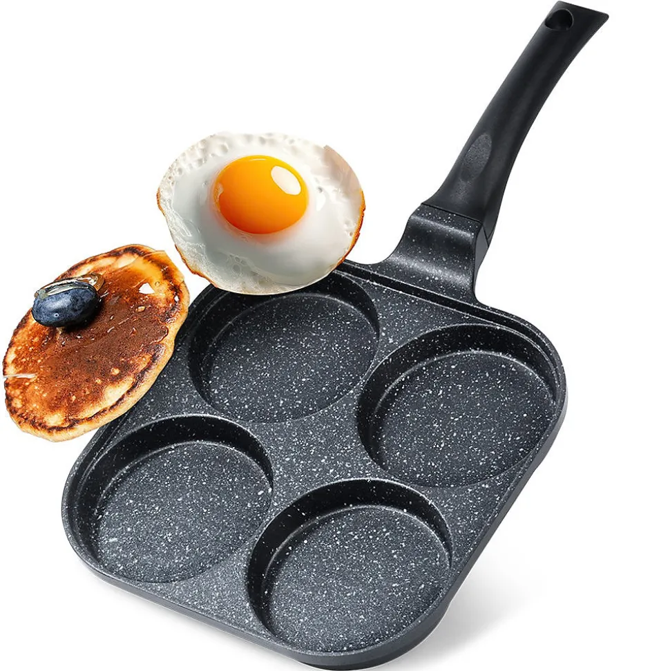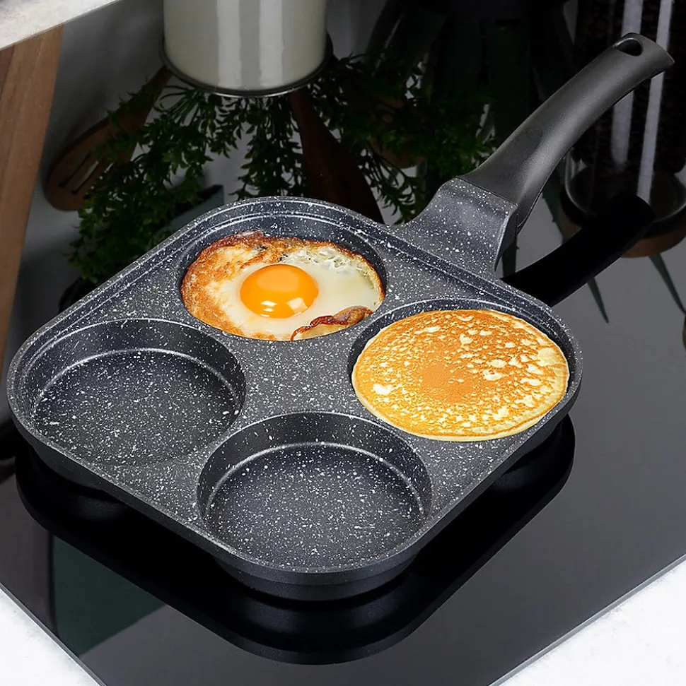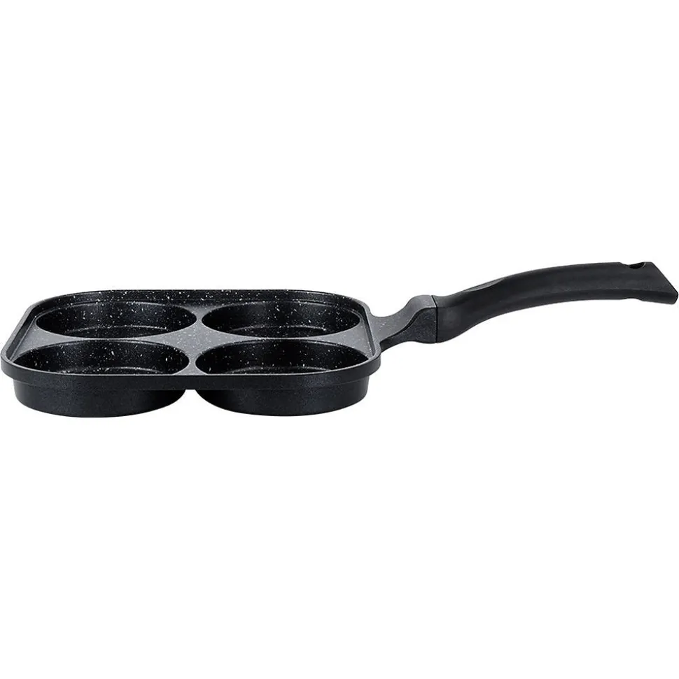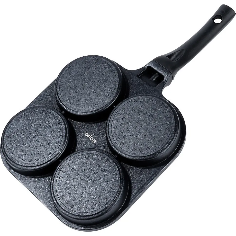 Découvrez la Poêle À Œufs En Granit Grande, l’ustensile conçu pour des œufs parfaitement ronds, des pancakes et des mini crêpes. Ses quatre orifices dédiés de 10 cm de diamètre, associés à une surface de cuisson interne de 22 x 22 cm, vous permettent d’obtenir des plats au format idéal à chaque utilisation. Dimensions extérieures: longueur 40 cm, hauteur de 2,8 cm (6 cm avec la poignée). Caractéristiques et avantages Revêtement antiadhésif granit PFLUON GRANIT en noir sur aluminium léger, pour une cuisson saine avec peu de matière grasse et un démoulage facile. Cuisson économe en énergie grâce à une excellente conductivité et à une répartition homogène de la chaleur qui réduit les temps de cuisson et les pertes. Cuisson uniforme et rapide pour œufs au plat, pancakes et mini crêpes en formes parfaites. Polyvalence de cuisson: compatible gaz, électrique, céramique, halogène et induction. Entretien pratique: compatible lave-vaisselle pour un nettoyage sans effort. Manche ergonomique et antidérapant assurant une prise en main sûre et confortable; œillet de suspension pratique pour le rangement et gagner de la place dans votre cuisine. Look intemporel et fonctionnel: design Grande série qui s’intègre élégamment à toutes les cuisines. Origine et norme: produit original de la marque tchèque Orion, fabriqué selon les normes européennes. Cette poêle à œufs en granit est la solution idéale pour obtenir des plats parfaitement façonnés tout en cuisant de manière efficace et uniforme. Parfaite pour les œufs sautés, les pancakes et les mini crêpes, elle allie performance, durabilité et élégance dans une seule pièce culinaire.