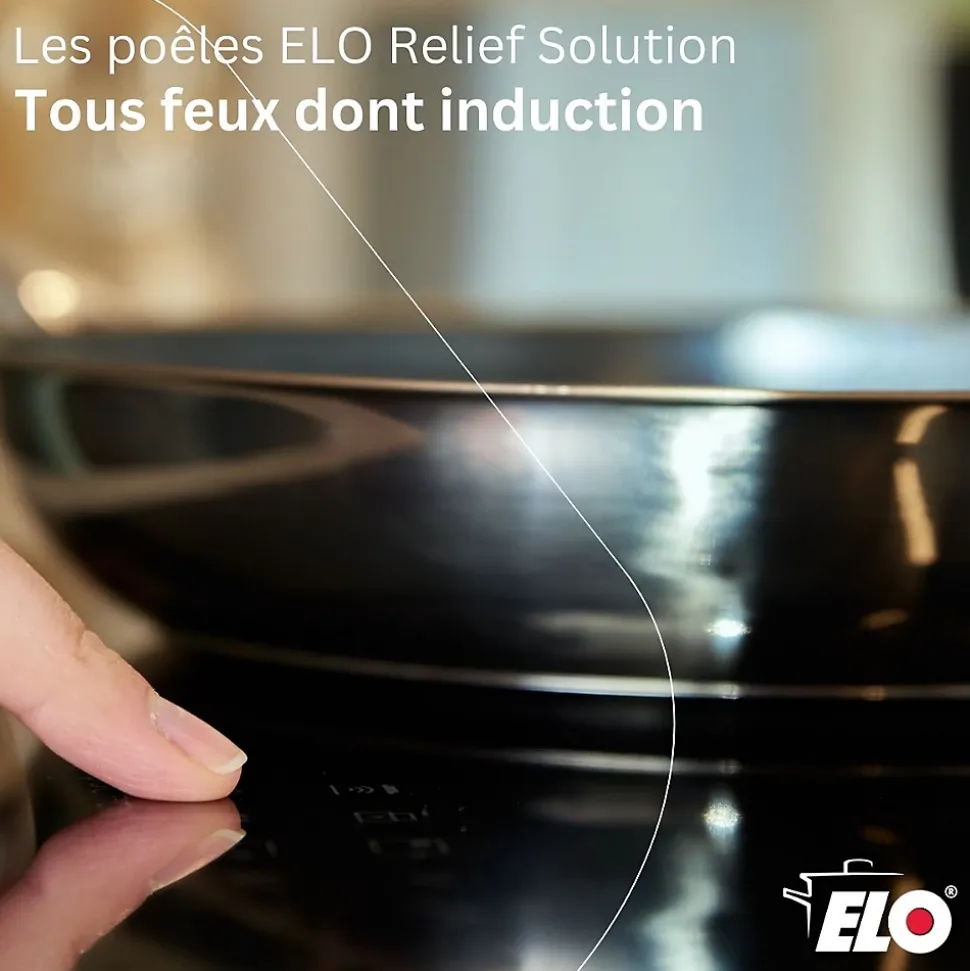 - ENTRETIEN : La poêle sans PFAS Elo Relief Solutions est facile à nettoyer avec son revêtement, avec une éponge douce et un liquide vaisselle
