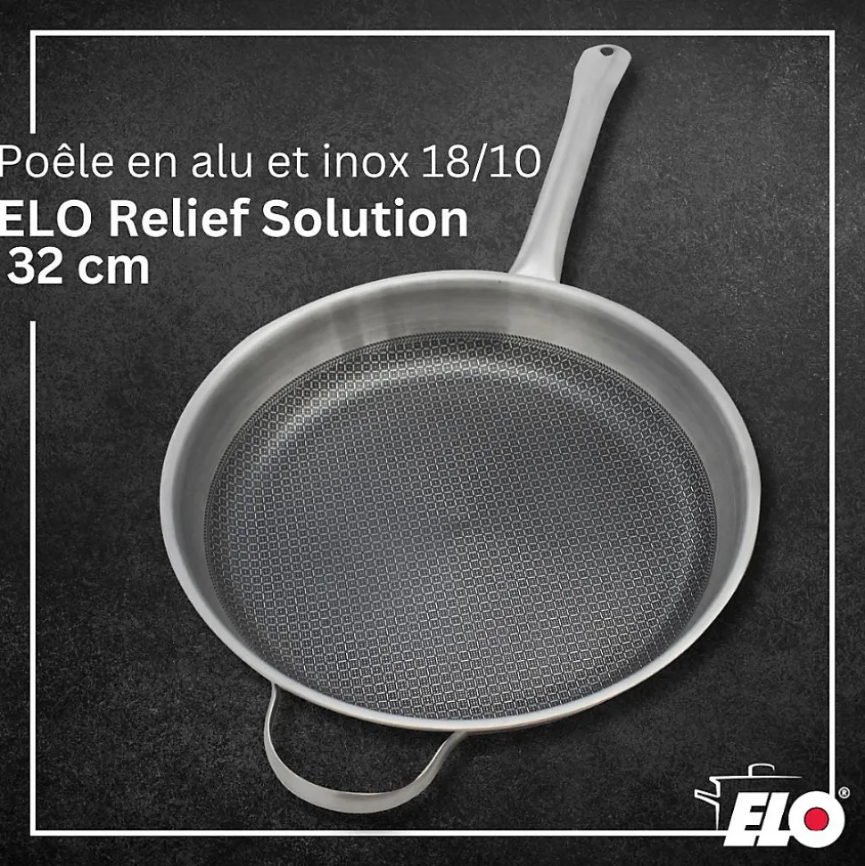 - DESCRIPTION : Poêle à frire Elo Relief Solutions 28 cm, en acier inoxydable 18/10 et aluminium, avec revêtement antiadhésif ELODUR Select sans PFAS, tous feux