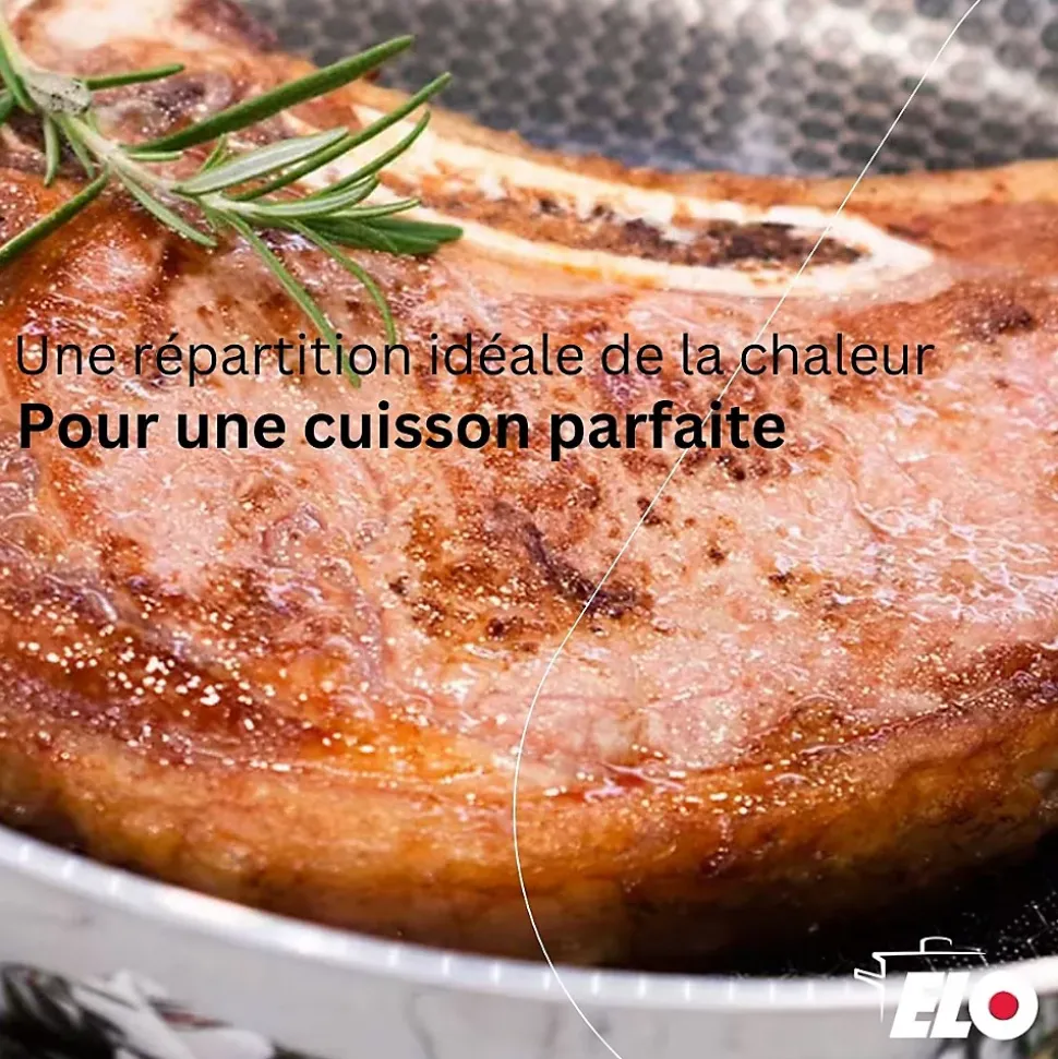DESCRIPTION : Poêle à frire Elo Relief Solutions 28 cm en acier inoxydable 18/10 et aluminium, avec revêtement antiadhésif ELODUR Select sans PFASPETIT + : Design moderne alliant élégance et fonctionnalité, avec un bord verseur et un manche creux au confort optimalCOMPOSITION : 3 couches de matériau superposées avec acier inoxydable 18/10, acier et aluminium ; revêtement antiadhésif minéral sans PFASDIMENSIONS : Poêle de cuisson de 28 cm idéale pour des préparations de 4 à 5 personnesUTILISATION : Poêle tous feux, y compris induction ; passe au four jusqu’à 240°C pour des recettes variéesENTRETIEN : La poêle sans PFAS Elo Relief Solutions est facile à nettoyer avec son revêtement, avec une éponge douceLes poêles Relief Solutions sont le fruit d’une technologie innovante, superposant 3 couches de matériau.A l’intérieur, l’acier inoxydable 18/10 de haute qualité, recouvert d’une vitrification antiadhésive minérale ELODUR Select sans PFAS est résistant aux rayures, rien n’y adhère. Au cœur, la couche intermédiaire en aluminium optimise la conductivité de la chaleur pour des résultats de cuisson parfaits, et amène plus de légèreté. A l’extérieur, la couche d’acier inoxydable assure la compatibilité tous feux dont induction. Ces poêles de cuisson passent aussi au four jusque 240° C.A l’image de leur qualité, leur design maîtrisé, alliant le noir et l’inox, est source de satisfaction en cuisine.Avec le bord verseur, aucune goutte ne tombe à côté et le manche creux en acier inoxydable est agréable à tenir.Cette poêle à frire 28 cm idéale pour 4 à 5 personnes, permet de préparer des plats à faible teneur en matières grasses. Facile à nettoyer grâce à son revêtement, avec une éponge douce.Un choix parfait pour une cuisine élégante et fonctionnelle.