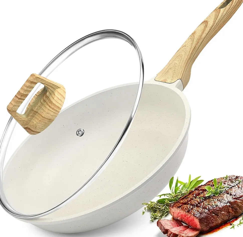 Cette poêle en céramique de 28 cm, fabriquée sans PTFE, PFAS, PFOA, PFOS, APEO, plomb ni cadmium et approuvée par SGS, offrant une cuisson sûre pour votre famille et respectueuse de l’environnement. Son revêtement antiadhésif permet aux aliments de glisser facilement et nécessite moins d’huile pour des préparations plus saines, idéale pour œufs, omelettes, pancakes et autres plats. La poignée en bakélite avec effet bois reste froide pendant la cuisson, garantissant une prise confortable et sécurisée. Compatible avec tous types de plaques, y compris gaz, électrique et induction, le noyau en aluminium répartit rapidement et uniformément la chaleur pour une cuisson parfaite. Facile à nettoyer, le revêtement résistant aux rayures conserve ses propriétés antiadhésives même après plusieurs passages au lave-vaisselle. La poêle est livrée avec un couvercle blanc pratique pour cuisiner ou servir directement.