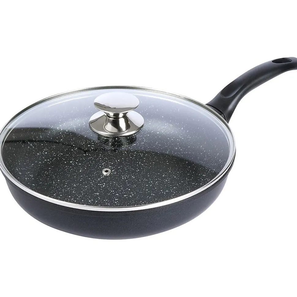 La poêle GRANDE en granit antiadhésive de 28 cm, accompagnée d’un couvercle en verre, est conçue pour la friture et le mijotage. Elle s’adresse à ceux qui recherchent une cuisson saine et efficace, avec une chaleur répartie uniformément et une longue durabilité. Caractéristiques Diamètre: 28 cm Dimensions extérieures: longueur 48 cm, hauteur de la poêle 6,5 cm, hauteur avec poignée 9 cm, hauteur avec couvercle 12 cm Matériau: aluminium moulé Couvercle: verre et acier inoxydable Revêtement: granit antiadhésif sans PFOA ni PTFE Poignée: matériau durable de couleur noire Utilisation: adaptée à la friture et au mijotage, avec peu d’huile Compatibilité: gaz, électrique, céramique, halogène et induction Entretien: compatible lave-vaisselle Accessoires: couvercle avec poignée et soupape d’évacuation de vapeur Origine: produit original de la marque tchèque Orion, fabriqué selon les normes européennes Avantages Cuisson homogène grâce à une répartition de chaleur efficace et au revêtement granit qui facilite la libération des aliments. Cuisson plus saine avec peu d’huile, sans compromettre le goût ni la texture des plats. Gain de temps et d’énergie: cuisson rapide et uniforme pour divers ingrédients (viandes, légumes, pancakes). Polyvalence d’utilisation sur tous types de plaques et induction, avec un couvercle transparent pour surveiller les plats sans révéler la chaleur. Conception robuste et durable, pensée pour durer et résister à un usage quotidien.