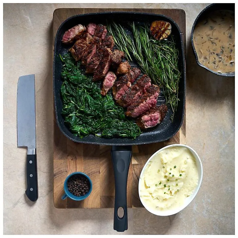 La poêle à griller avec revêtement en marbre Royalty Line RLFGN24 est un accessoire de cuisine durable et polyvalent conçu pour des repas parfaitement grillés. Fabriquée en aluminium robuste, cette poêle est conçue pour résister à des années d’utilisation quotidienne sans se déformer ni rouiller. Son revêtement antiadhésif en marbre garantit que les aliments se détachent sans effort, réduisant ainsi le besoin d’excès d’huile tout en évitant les rayures et les dommages. Que vous fassiez griller de la viande, du poisson ou des légumes, cette poêle garantit une délicieuse cuisson avec une chaleur uniformément répartie pour des résultats de qualité professionnelle.Dotée de nervures de gril surélevées, la RL-FGN24 crée de belles marques de gril tout en permettant à la graisse de s’écouler pour une cuisson plus saine. Les becs verseurs doubles intégrés des deux côtés offrent une commodité, facilitant l’élimination de l’excès de graisse et des sauces sans dégâts. Sa poignée ergonomique offre une prise en main confortable et sûre, garantissant sécurité et facilité lors de la manœuvre de la poêle pendant la cuisson. Conçue pour les chefs à domicile et les amateurs de cuisine, cette poêle apporte l’équilibre parfait entre fonctionnalité et style à votre cuisine.L’entretien est simple, car le revêtement antiadhésif permet un nettoyage rapide et la poêle passe au lave-vaisselle pour plus de commodité. Pour préserver sa longévité, il est recommandé d’utiliser des ustensiles en bois ou en plastique haute température et d’éviter les produits de nettoyage agressifs. La Royalty Line RL-FGN24 est un incontournable pour tous ceux qui cherchent à réaliser des grillades de qualité restaurant à la maison, alliant durabilité, cuisson sans effort et design moderne et élégant.Caractéristiques :Construction en aluminium robuste – Fabriquée en aluminium de haute qualité, cette poêle à griller est conçue pour une