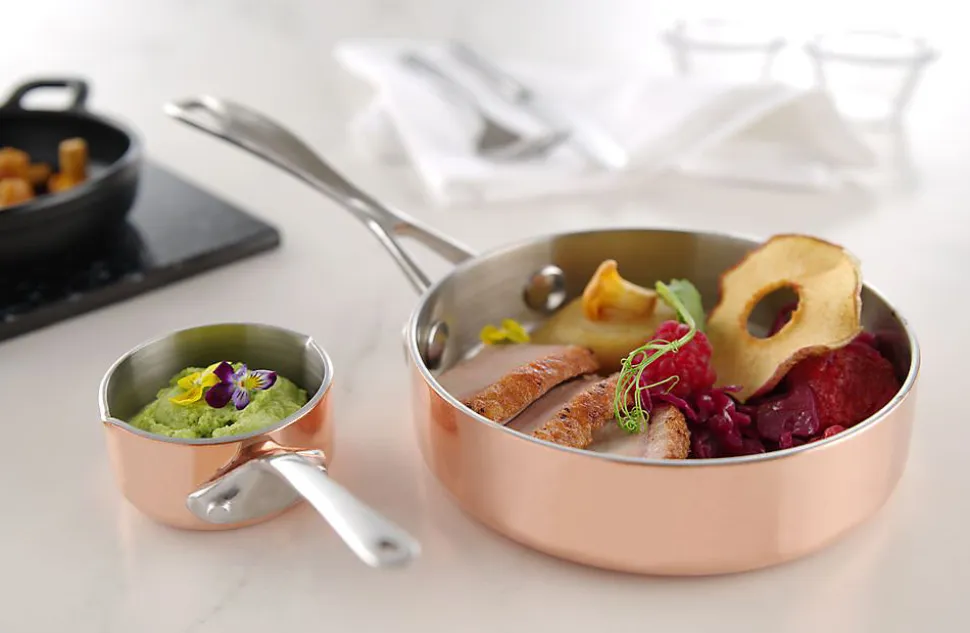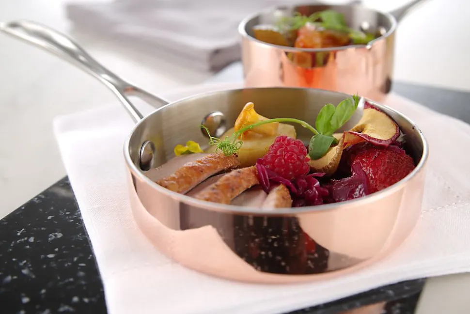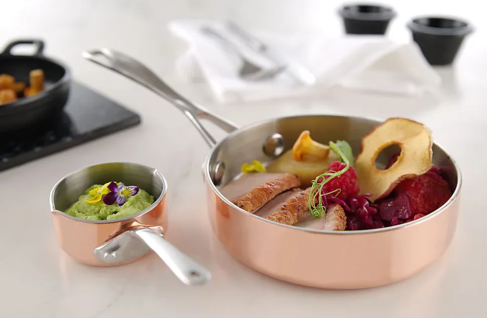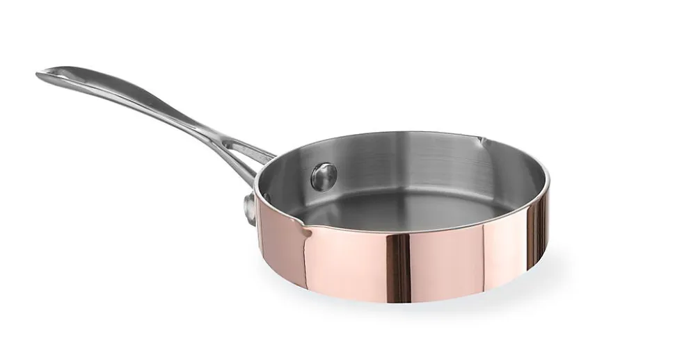 Poêle miniature 120x(H)30mm Fait en matériau en 3 couches d’une épaisseur de 2,5 mm: cuivre/aluminium/inox. Manche riveté.