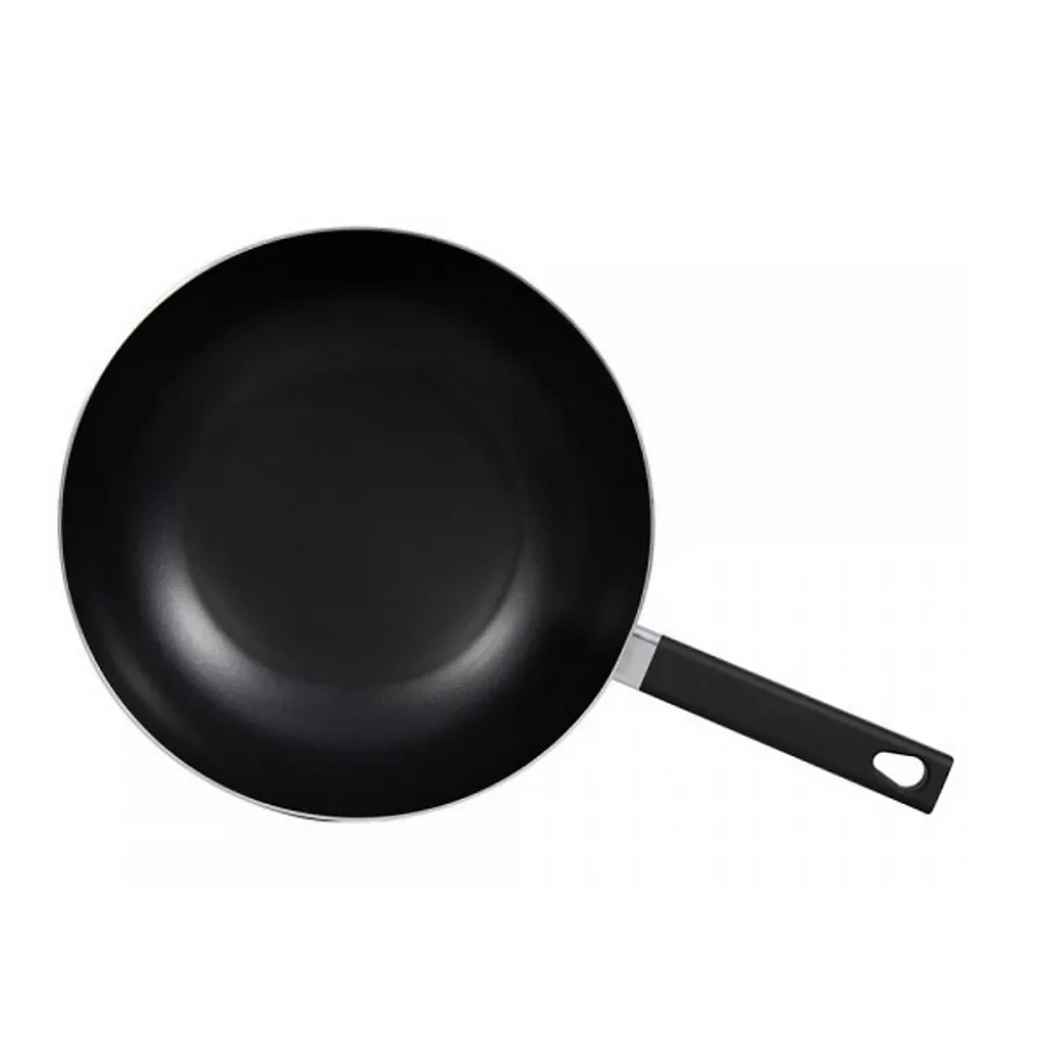 Wok Livoo 32 cm en aluminium avec revêtement antiadhésif sans PFOA ni PFOS, fond inox dimpled compatible induction, manche soft-touch en silicone résistant à la chaleur, compatible tous feux et lave-vaisselle. Léger, robuste et idéal pour sautés et cuissons quotidiennes. Modèle MEP156R.