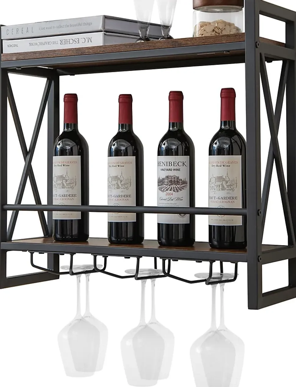 Ce casier à vin peu encombrant peut stocker quelques bouteilles de votre vin préféré. Les 2 étagères offrent l’espace de rangement pour divers articles, y compris des bouteilles de vin, des décorations, etc. De plus, 3 rangées de porte-verres peuvent contenir jusqu’à 12 verres. Fabriqué à partir de panneaux de particules et de cadre en métal robuste, ce support à vin est assez solide pour résister à l’épreuve du temps. Avec un design industriel, cette étagère de rangement murale est un excellent ajout à la maison, le bar, la cave ou le bistrot.