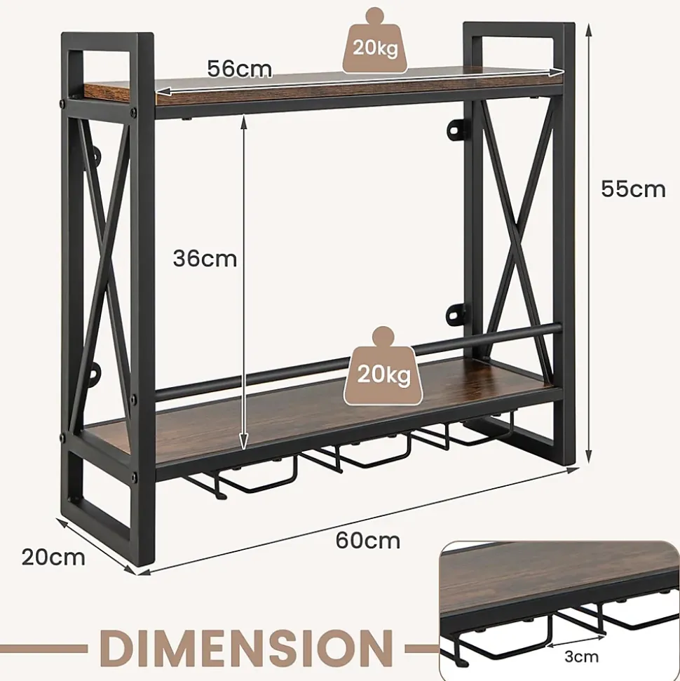 Matériaux : métal, panneaux de particulesDimensions totales : 60 x 20 x 55 cm (L x l x H)Taille de chaque étagère : 56 x 20 cm (L x l)Poids net : 5,5 kgCapacité de poids de chaque étagère : 20 kgLivraisons :1 x Porte-bouteilles de vin mural1 x Manuel d’instructions