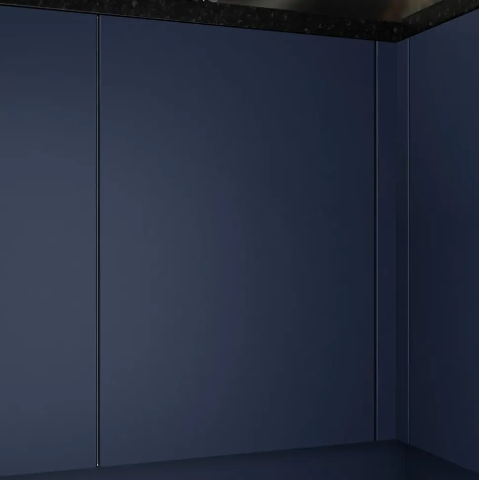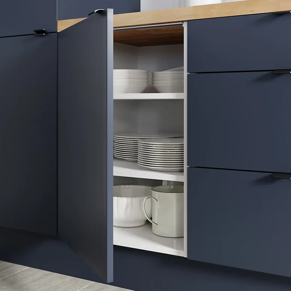 Notre gamme présente les dernières tendances en matière de styles, de couleurs et de finitions de porte. Le tout se coordonne parfaitement avec notre gamme GoodHome pour la cuisine. Nos portes mates Stevia reflètent la lumière et la couleur de vos murs. En général, plus la finition est claire, plus l’espace semblera lumineux. Ces portes sont idéales pour les petits espaces, car les reflets de la lumière agrandissent la pièce et la rendent plus lumineuse. La finition lisse de ces portes facilite le nettoyage des éclaboussures de cuisine. Bleu marine mat – ces portes et façades de tiroir bleues lumineuses et immaculées sont le complément idéal pour une cuisine moderne