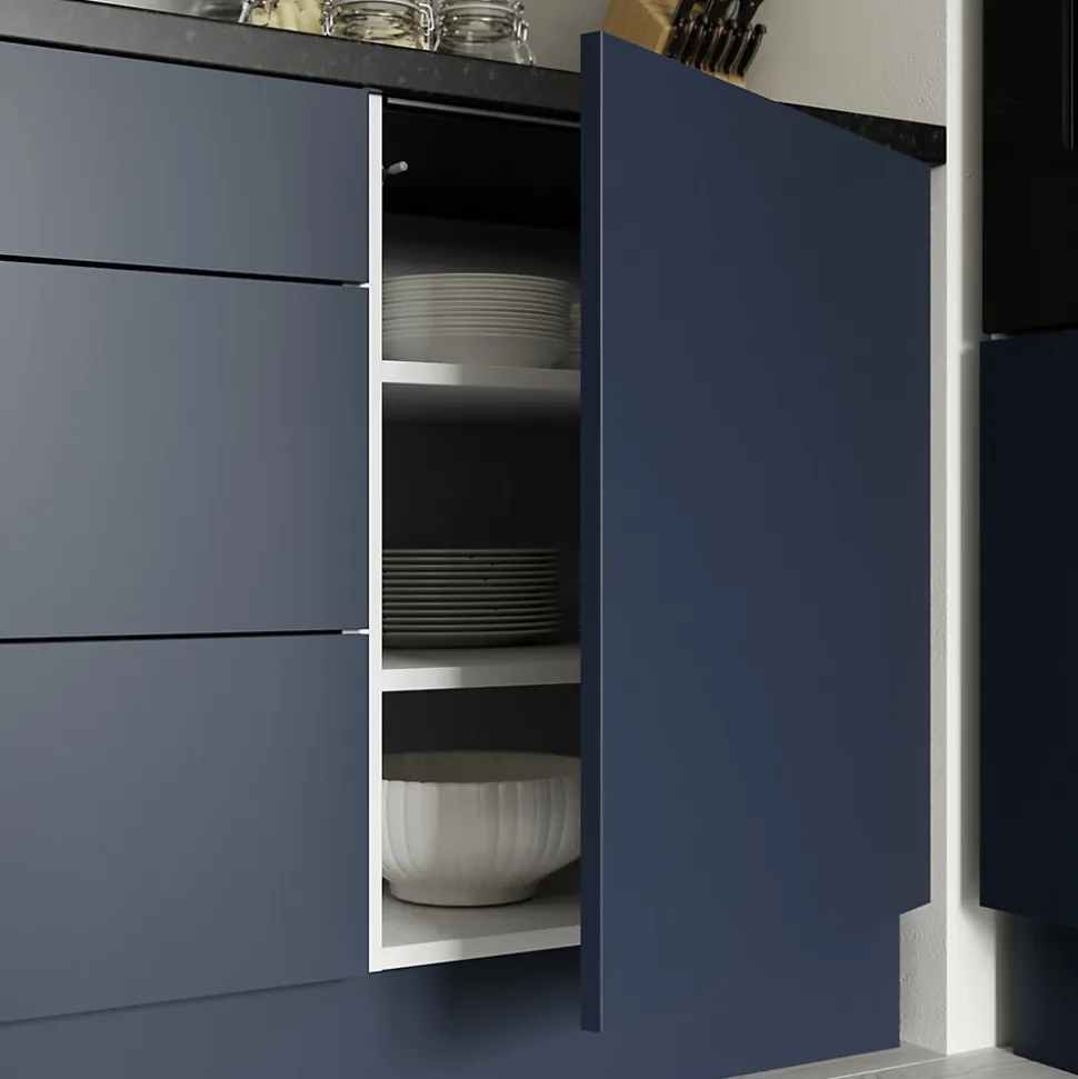 Notre gamme présente les dernières tendances en matière de styles, de couleurs et de finitions de porte. Le tout se coordonne parfaitement avec notre gamme GoodHome pour la cuisine. Nos portes mates Stevia reflètent la lumière et la couleur de vos murs. En général, plus la finition est claire, plus l’espace semblera lumineux. Ces portes sont idéales pour les petits espaces, car les reflets de la lumière agrandissent la pièce et la rendent plus lumineuse. La finition lisse de ces portes facilite le nettoyage des éclaboussures de cuisine. Bleu marine mat – ces portes et façades de tiroir bleues lumineuses et immaculées sont le complément idéal pour une cuisine moderne.