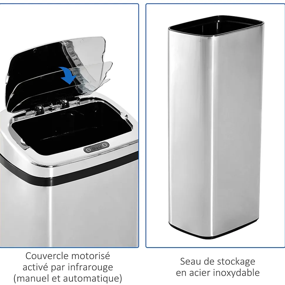 Contrairement aux poubelles classiques, la poubelle automatique HOMCOM est équipée d’un capteur infrarouge pour une utilisation plus pratique. Le capteur détecte les mouvements, ouvre automatiquement le couvercle et le referme après quelques secondes d’inutilisation. Vous pouvez également ouvrir la poubelle électrique à la main en appuyant sur les boutons situés sur le couvercle.Caractéristiques :- Poubelle avec un bac interne d’une capacité de 50 litres au design élégant- Acier inoxydable de haute qualité pour une longue durée de vie- La poubelle à détecteur de mouvement permet au couvercle de s’ouvrir et de se fermer automatiquement- Le capteur situé dans le couvercle a une portée de 15-20 cm, ce qui réduit l’ouverture inutile du couvercle- Vous pouvez également ouvrir la poubelle manuellement à l’aide des boutons situés sur le couvercle- Interrupteur marche/arrêt à l’arrière- Bac intérieur amovible avec poignée pour faciliter le vidage et le lavage- Fonctionne avec 4 piles AA (non incluses)Spécifications :- Couleur : argent- Matériau : ABS (couvercle), acier inoxydable 403- Capacité : 50L- Dimensions totales : 33L x 25l x 84H cm- Distance du capteur : 15-20 cm- Pile : 4 x AA (NON INCLUS)- Réf. : 851-004